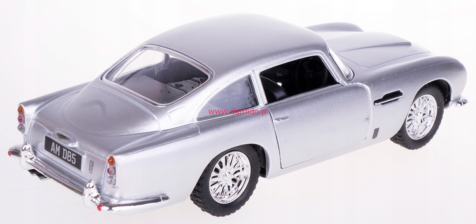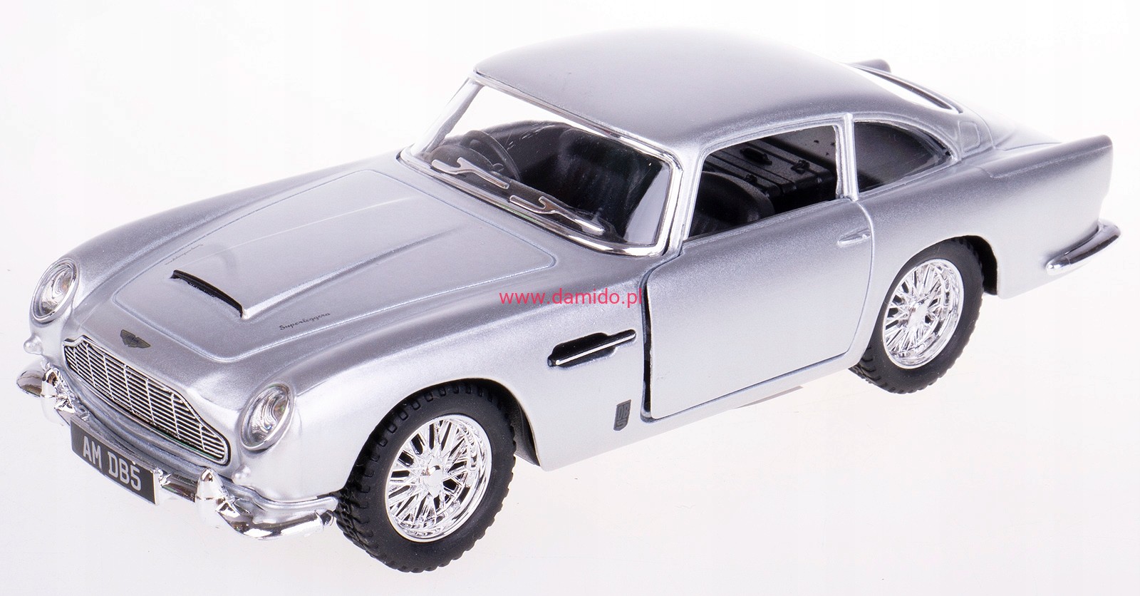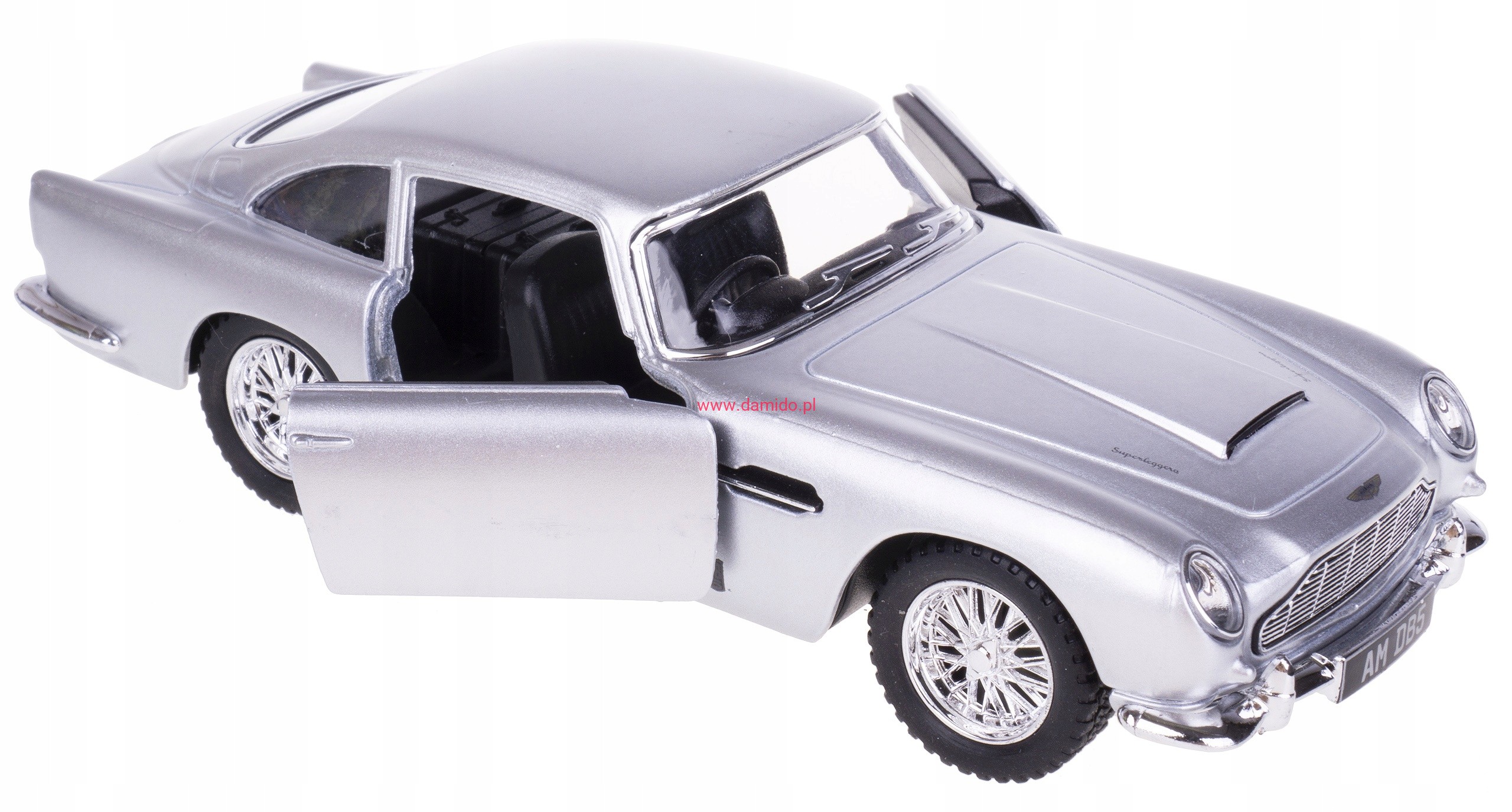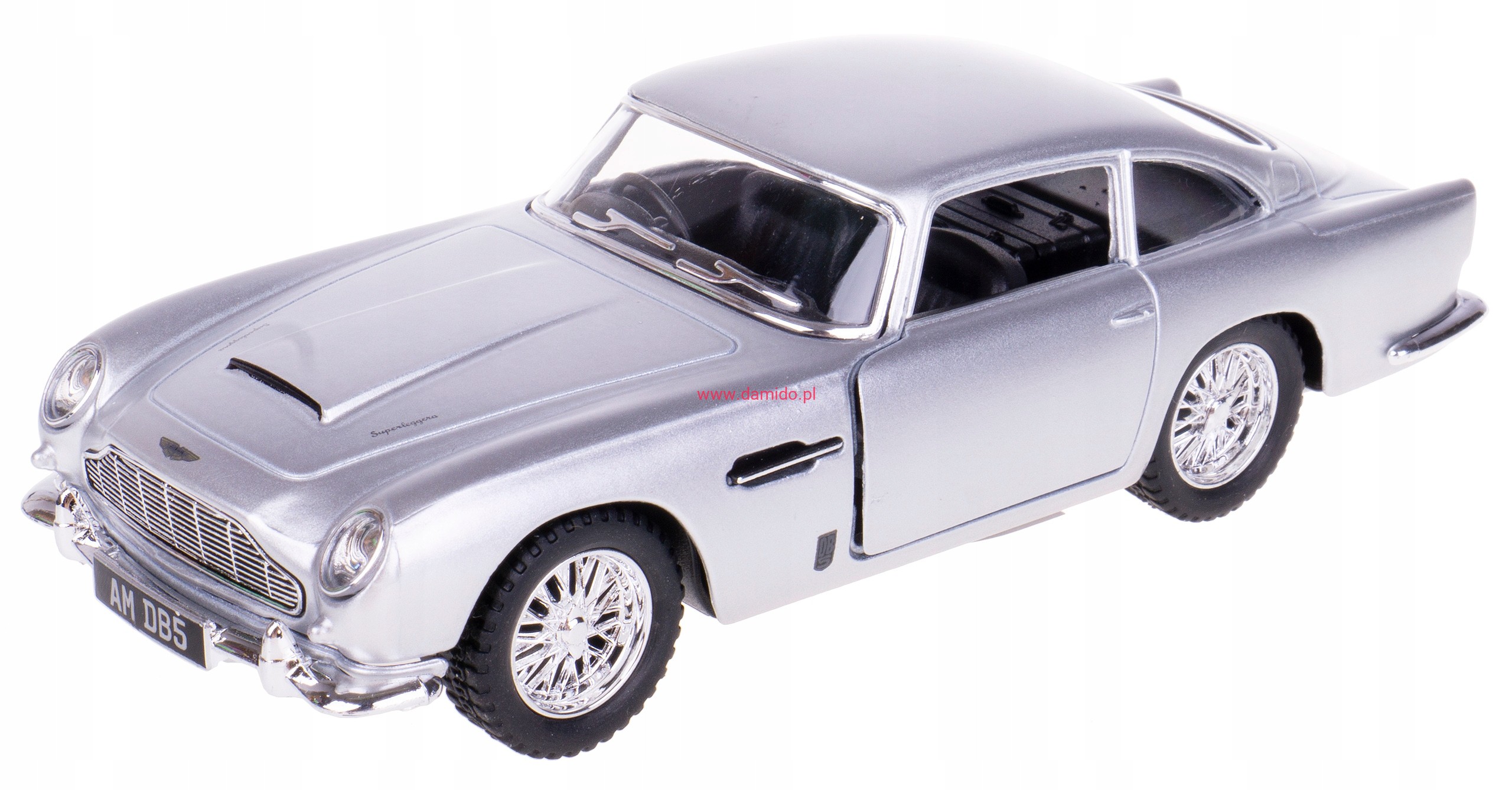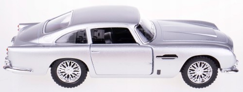 Model metalowy ASTON MARTIN DB5 w skali 1:38 z napędem typu ''Pull Back". Model wykonany z metalu i plastiku. Posiada otwierane boczne drzwi, przez które można zajrzeć do wnętrza modelu oraz posiada gumowe opony.