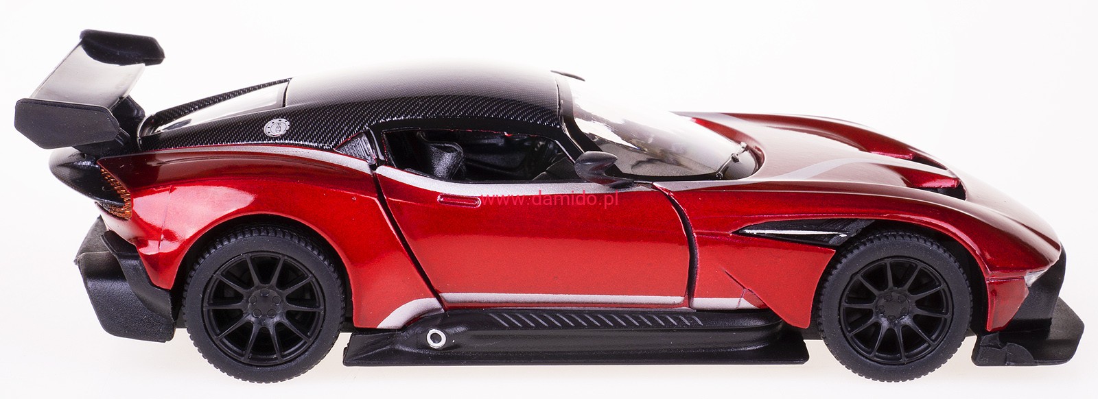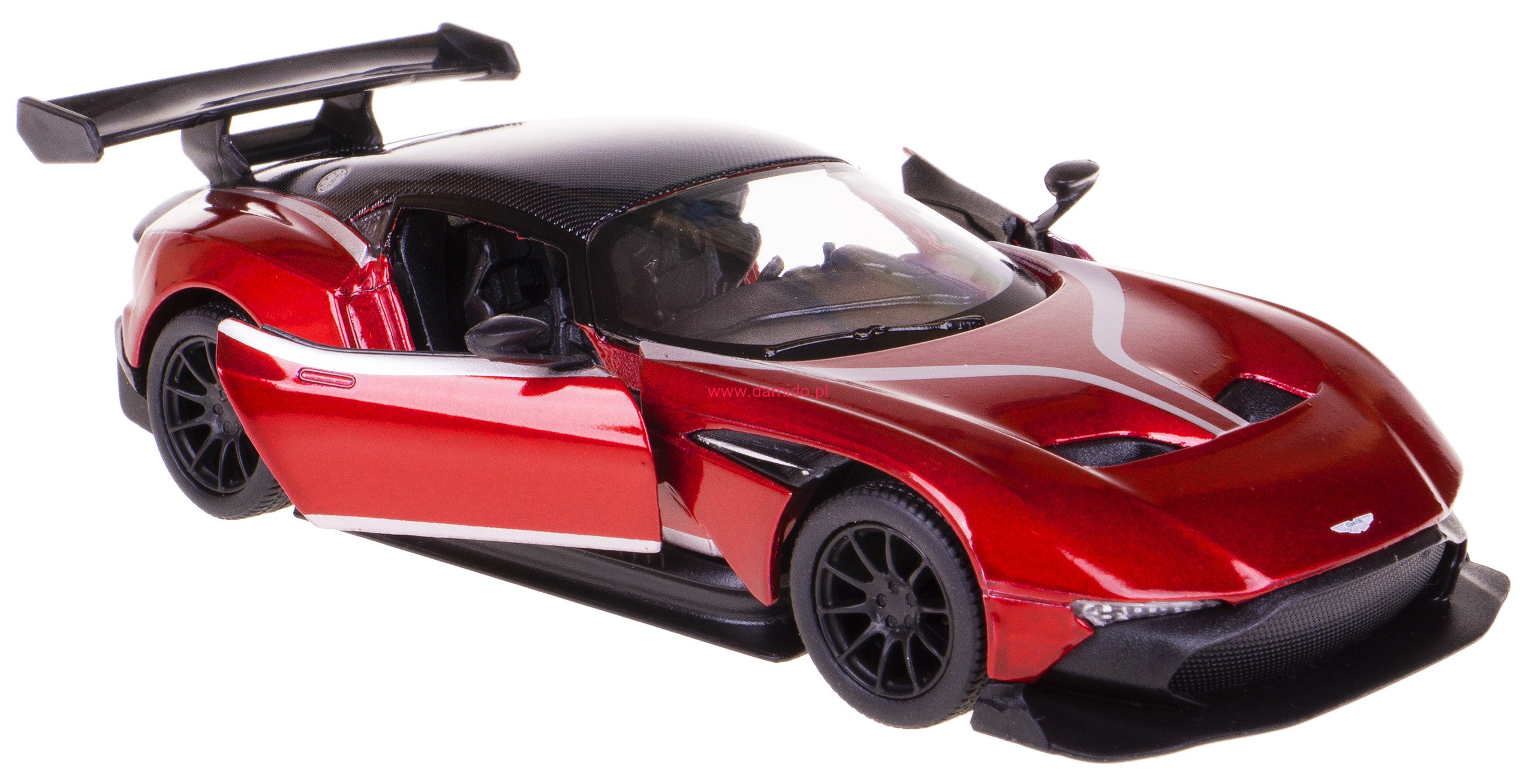 Model metalowy ASTON MARTIN VULCAN LIVERY EDITION w skali 1:38 z napędem typu ''Pull Back". Model wykonany z metalu i plastiku. Posiada otwierane boczne drzwi, przez które można zajrzeć do wnętrza modelu oraz posiada gumowe opony.