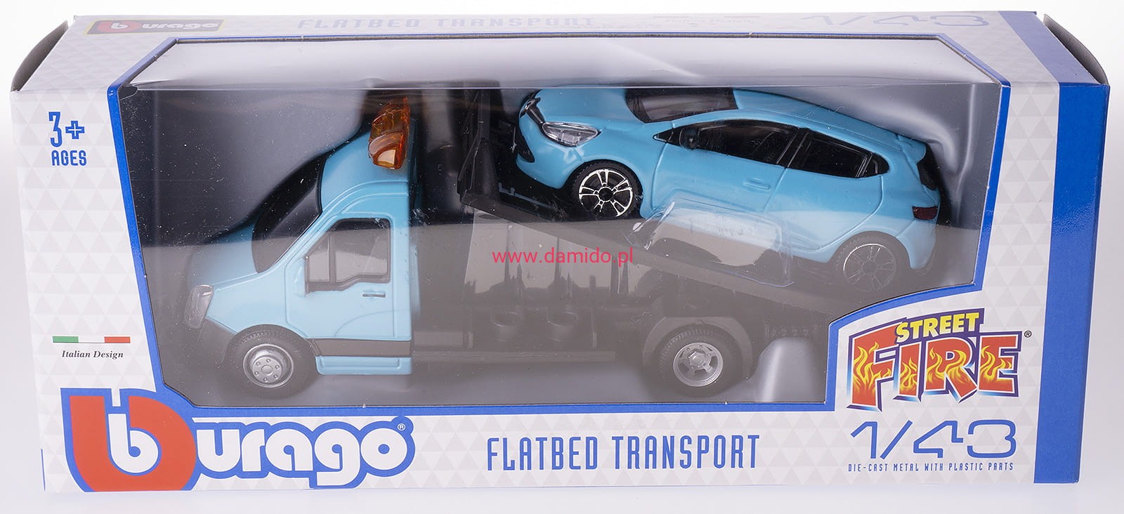 Zestaw Bburago składający się z auto lawety transportowej z podnoszoną i opuszczaną rampą oraz modelu Renault Clio w skali 1:43.