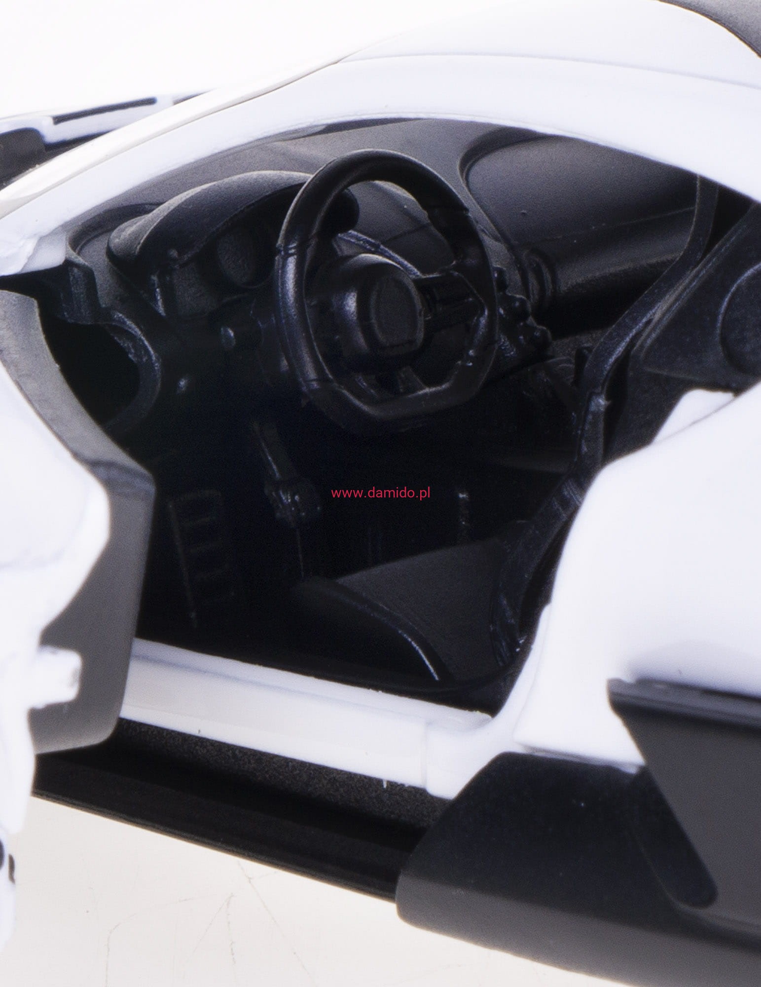 Posiada otwierane boczne drzwi, przez które można zajrzeć do wnętrza modelu oraz posiada gumowe opony.