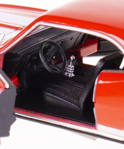 Model metalowy 1967 CHEVROLET CAMARO Z-28 w skali 1:37 z napędem typu ''Pull Back". Model wykonany z metalu i plastiku. Posiada otwierane boczne drzwi, przez które można zajrzeć do wnętrza modelu oraz posiada gumowe opony.