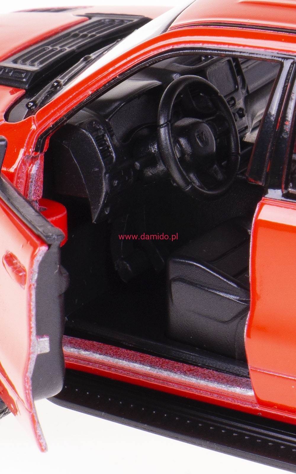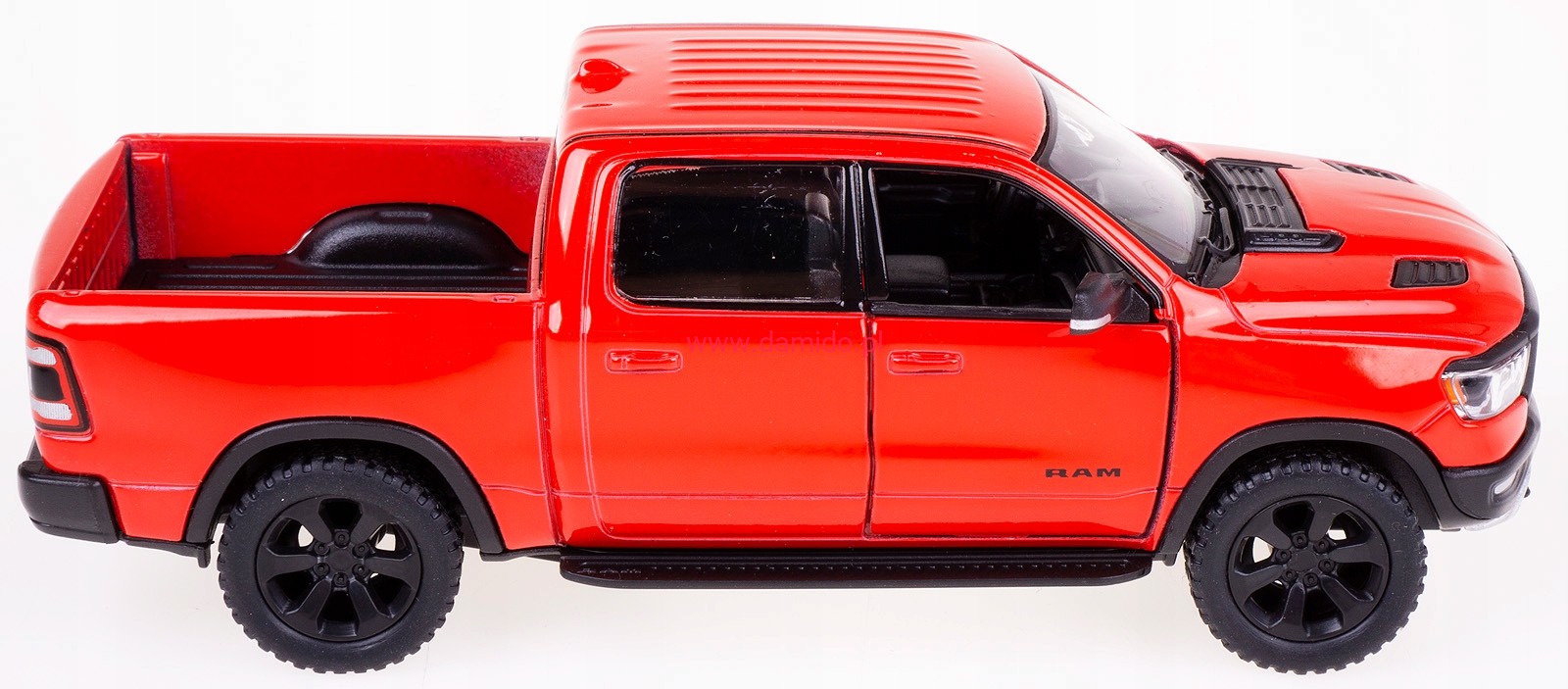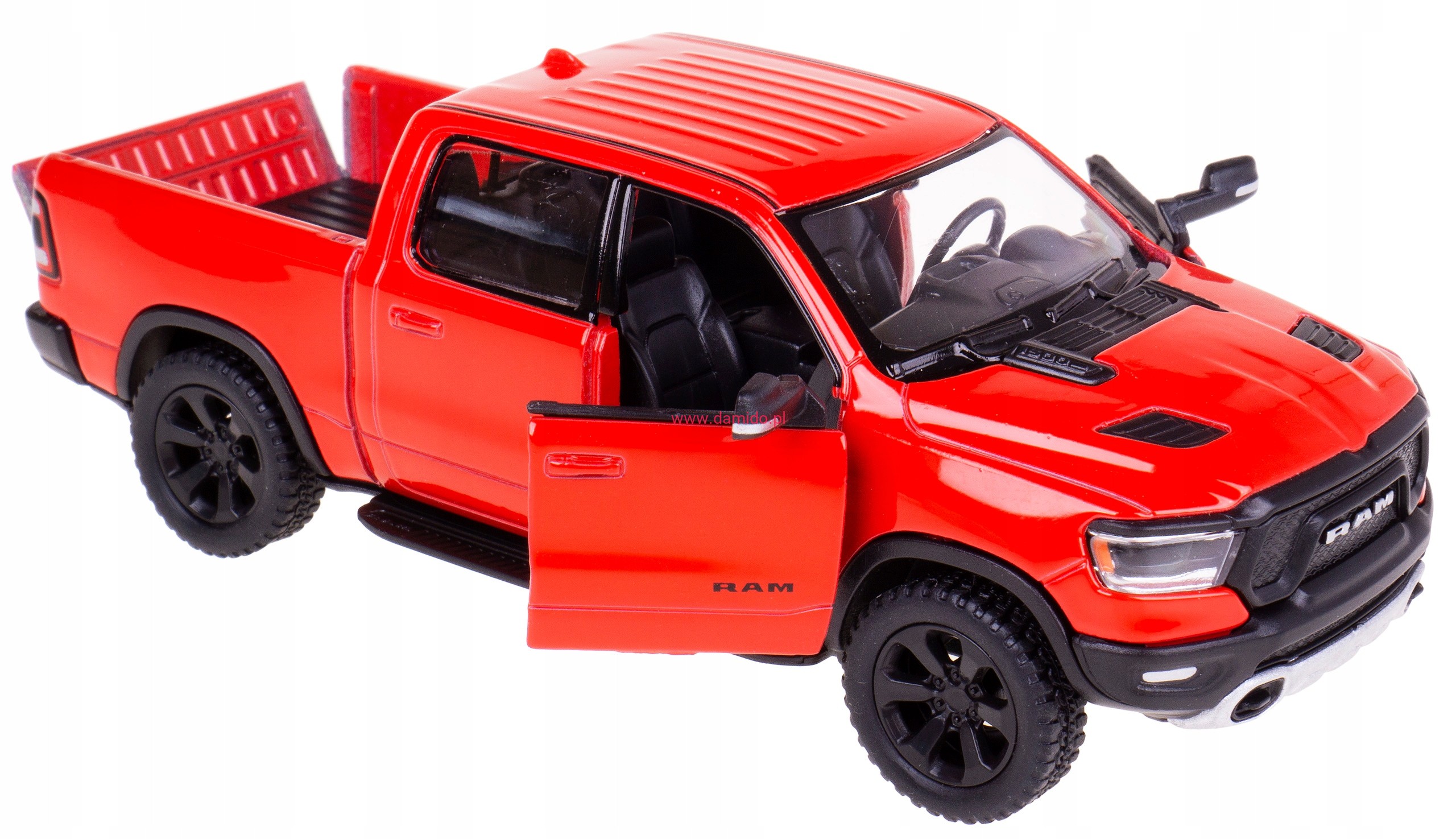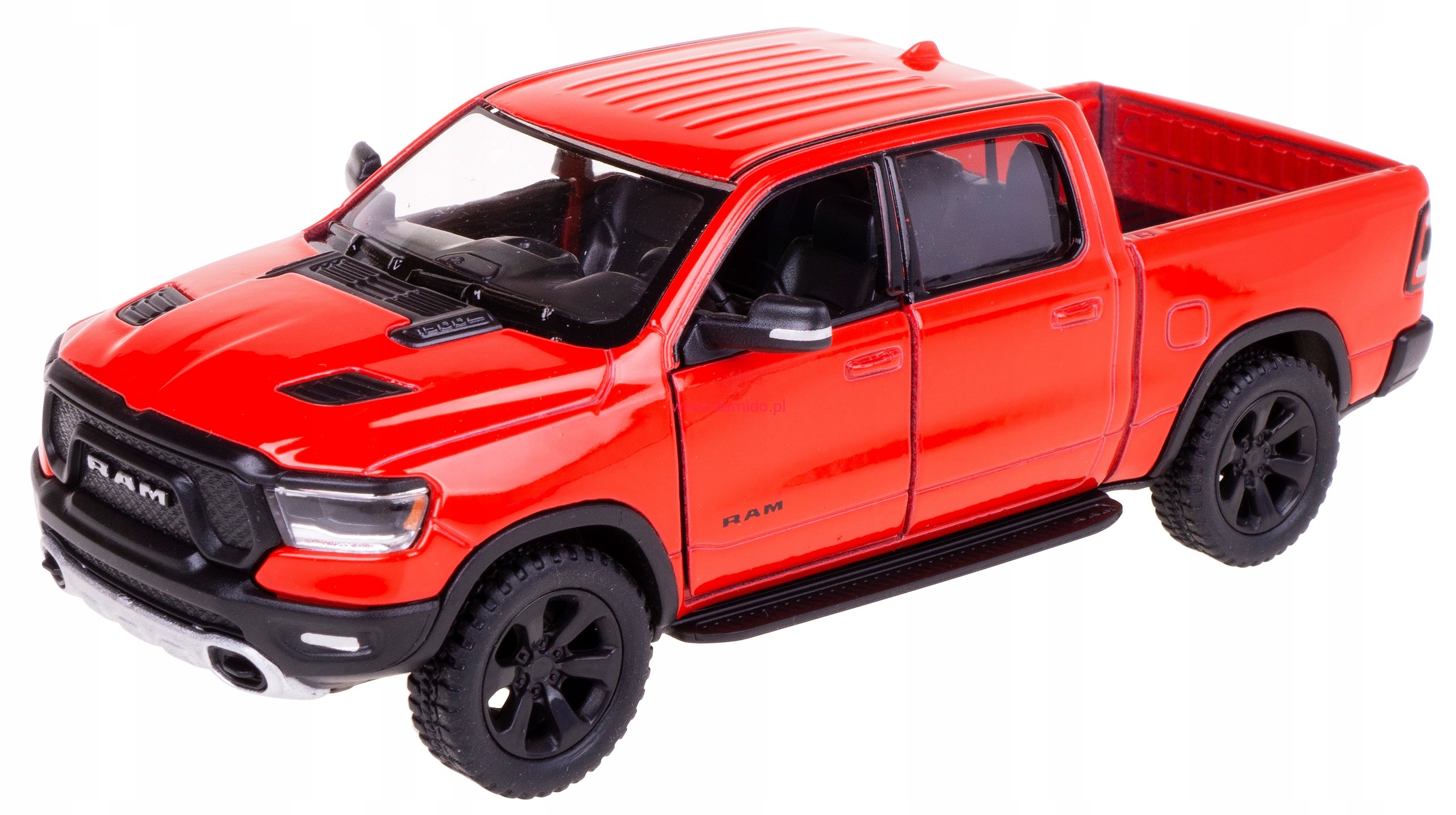 Model metalowy DODGE RAM 1500 w skali 1:46 z napędem typu ''Pull Back". Model wykonany z metalu i plastiku. Posiada otwieraną tylną klapę i boczne drzwi, przez które można zajrzeć do wnętrza modelu oraz posiada gumowe opony.