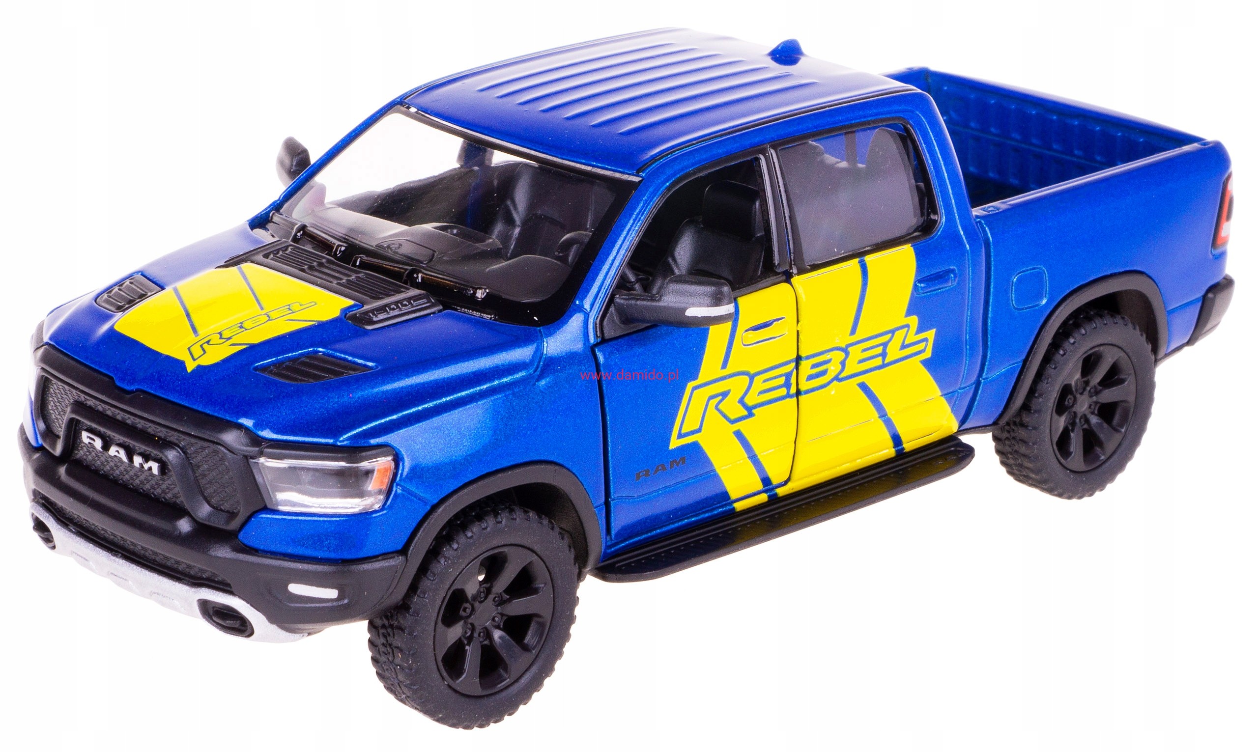 Model metalowy DODGE RAM 1500 REBEL w skali 1:46 z napędem typu ''Pull Back". Model wykonany z metalu i plastiku.