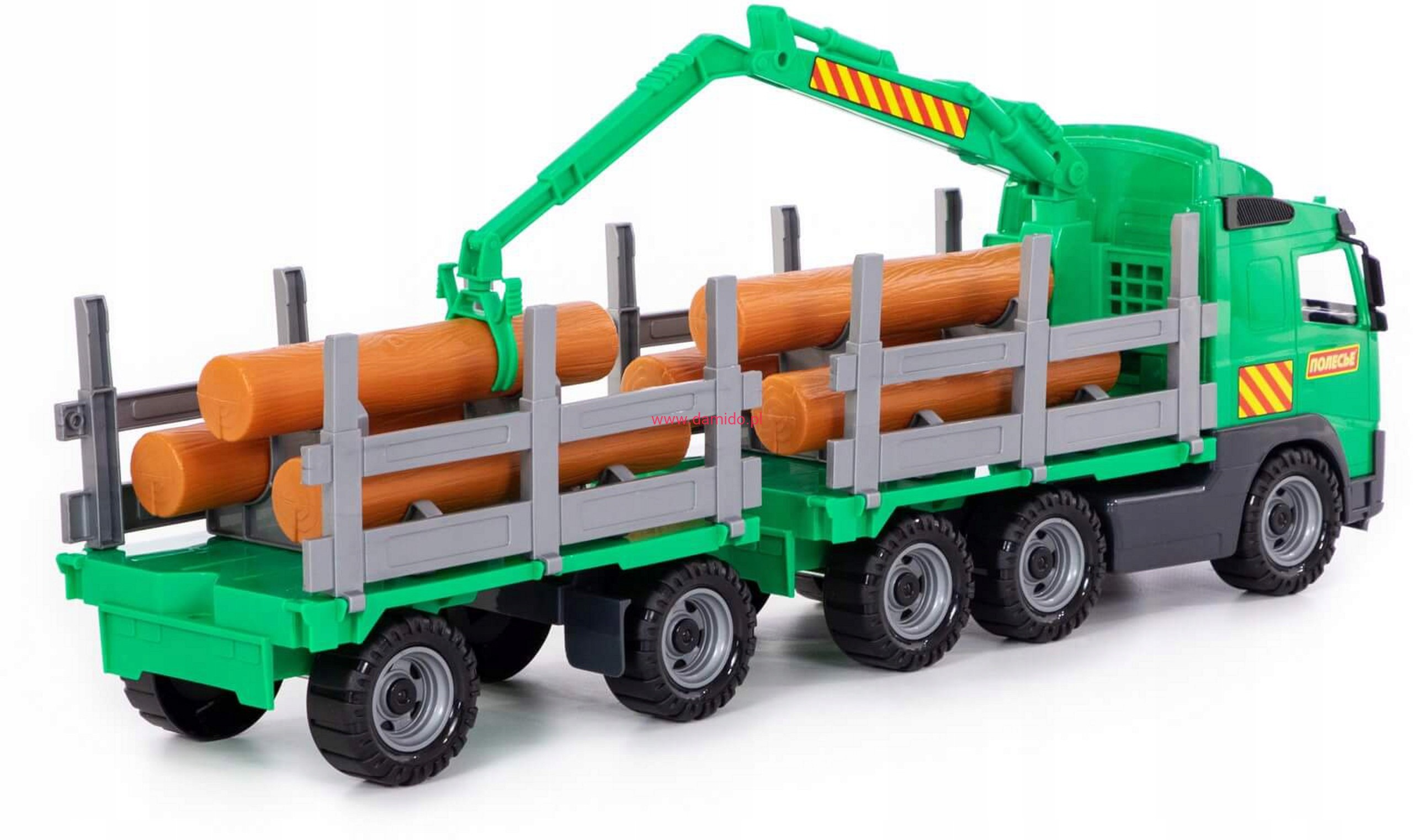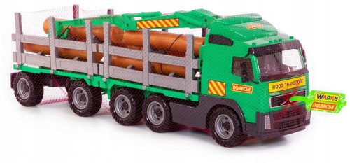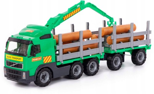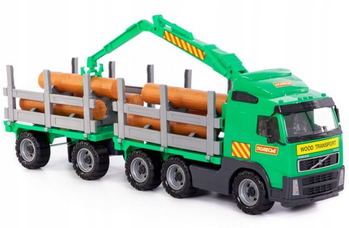 Samochód do przewozu dłużyc z przyczepą VOLVO to duża ciężarówka wyposażony w szerokie koła połączone metalowymi osiami. Ich struktura nie jest gładka, co ułatwia jazdę po nierównych powierzchniach. . Na naczepie znajduje się miejsce do przewozu kłód drewna, które to dołączono do zestawu.