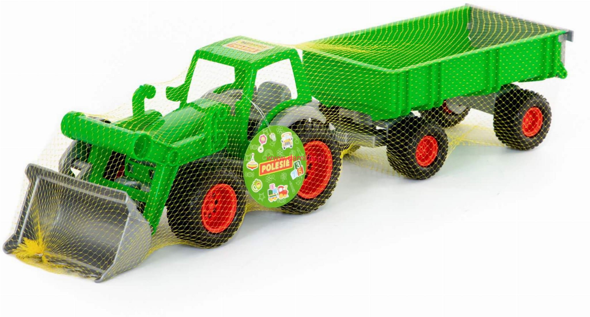 Traktor-ładowarka z przyczepą FARMER TECHNIC to pojazd złożony z dwóch części. Jedna z nich to traktor, wyposażony w łyżkę. Można nią łatwo manipulować dzięki ruchomemu ramieniu oraz rączce.