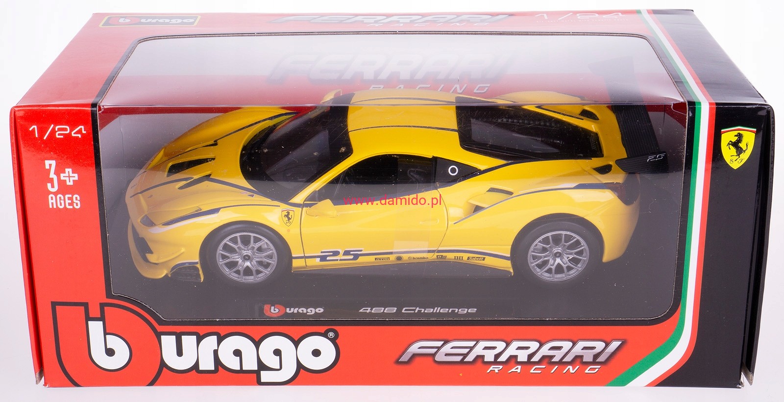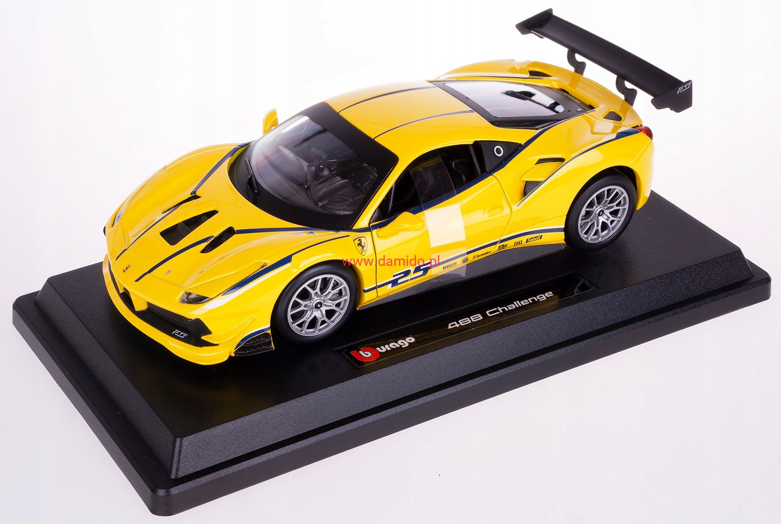 Model FERRARI 488 CHALLENGE wykonany został z metalu i plastiku na gumowych oponach w skali 1:24 firmy BBURAGO.