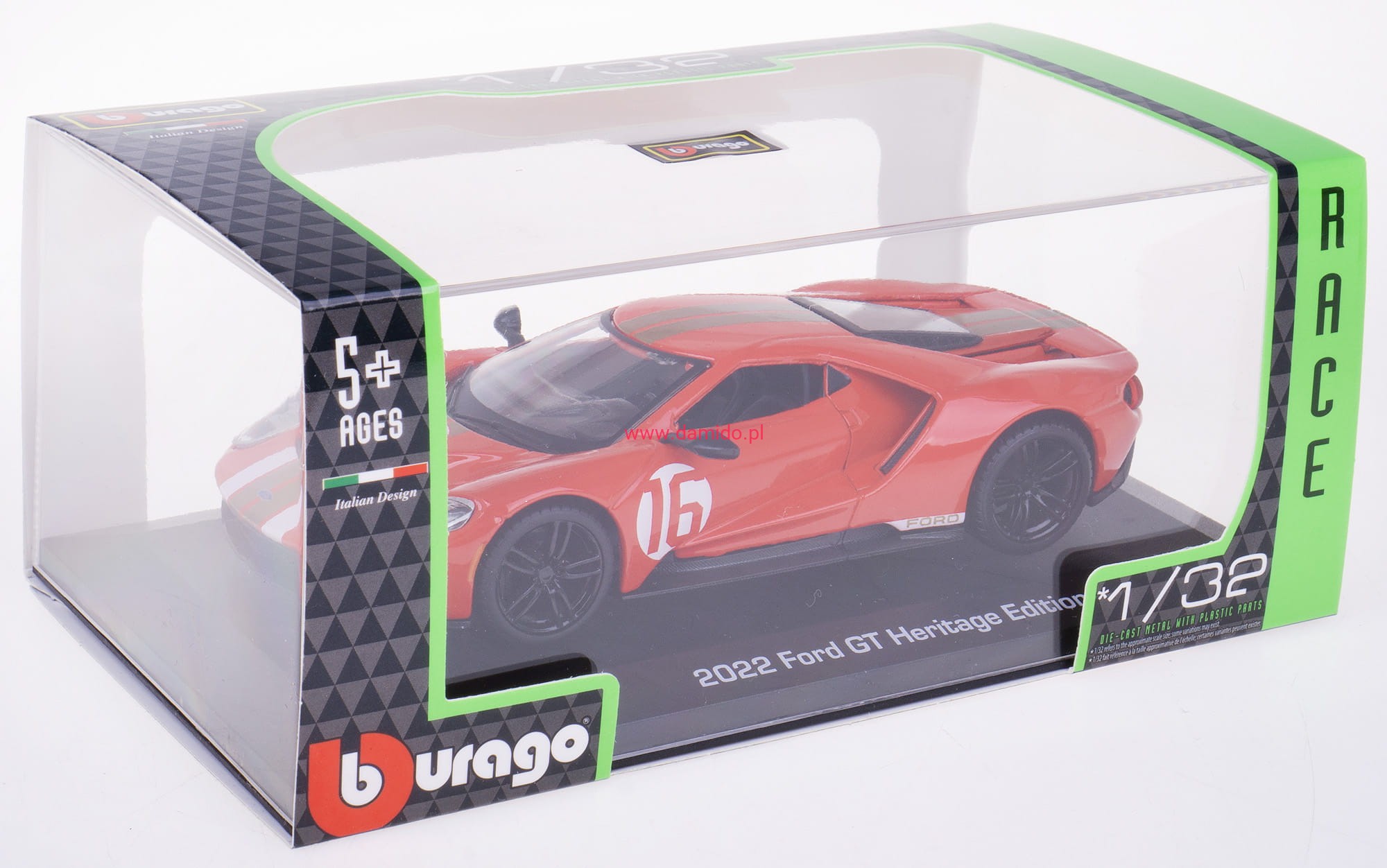 Model metalowy FORD GT 2022 HERITAGE EDITION #16 wykonany jest w skali 1:32 firmy BBURAGO.