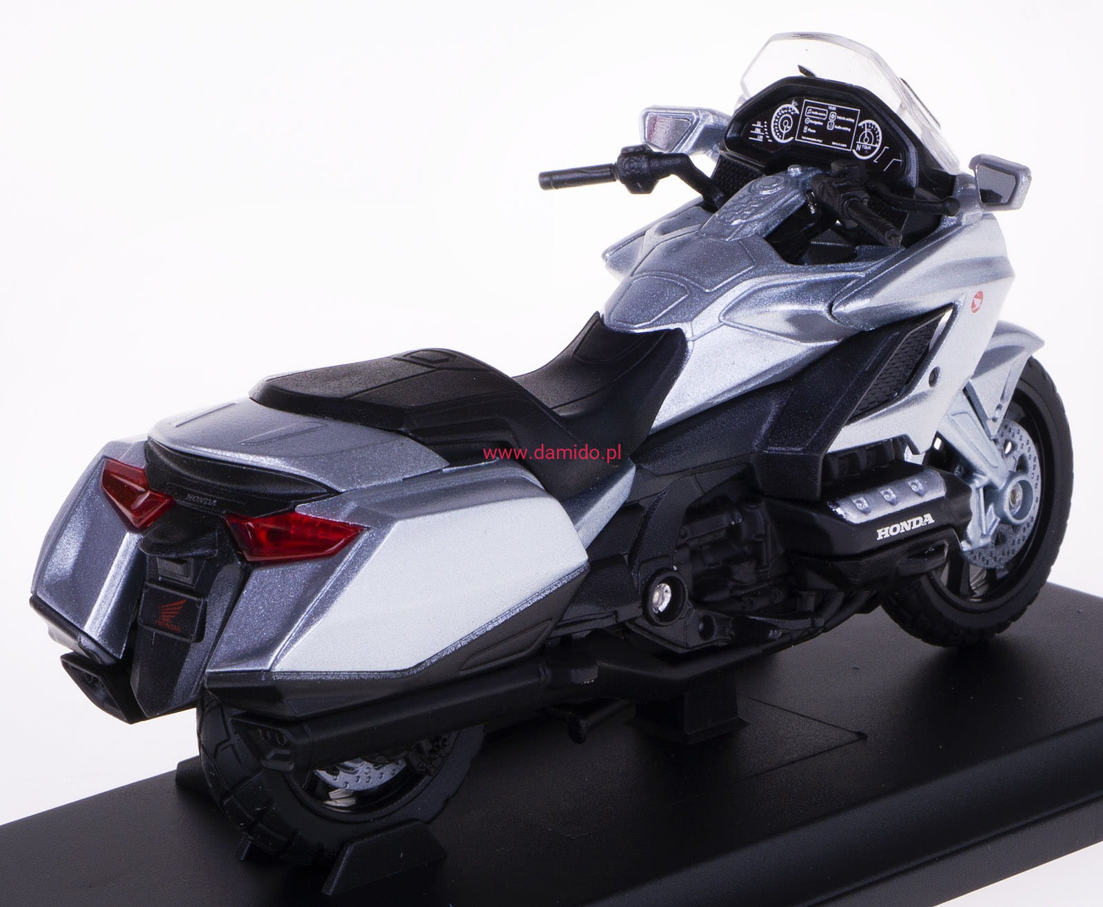 Model motocykla Hondy Gold Wing wykonany jest z plastiku, posiada skrętną kierownicę, obrotowe koła, gumowe opony, rozkładaną boczną stopkę, amortyzowane tylne zawieszenie.
