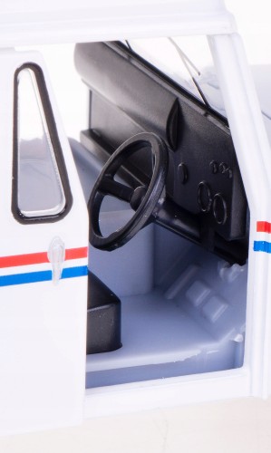 Posiada przesuwane boczne drzwi, przez które można zajrzeć do wnętrza modelu oraz posiada gumowe opony.