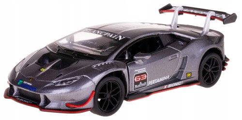 Model LAMBORGHINI HURACAN LP620-2 wykonany jest z metalu i plastiku z napędem pull-back w skali 1:36.