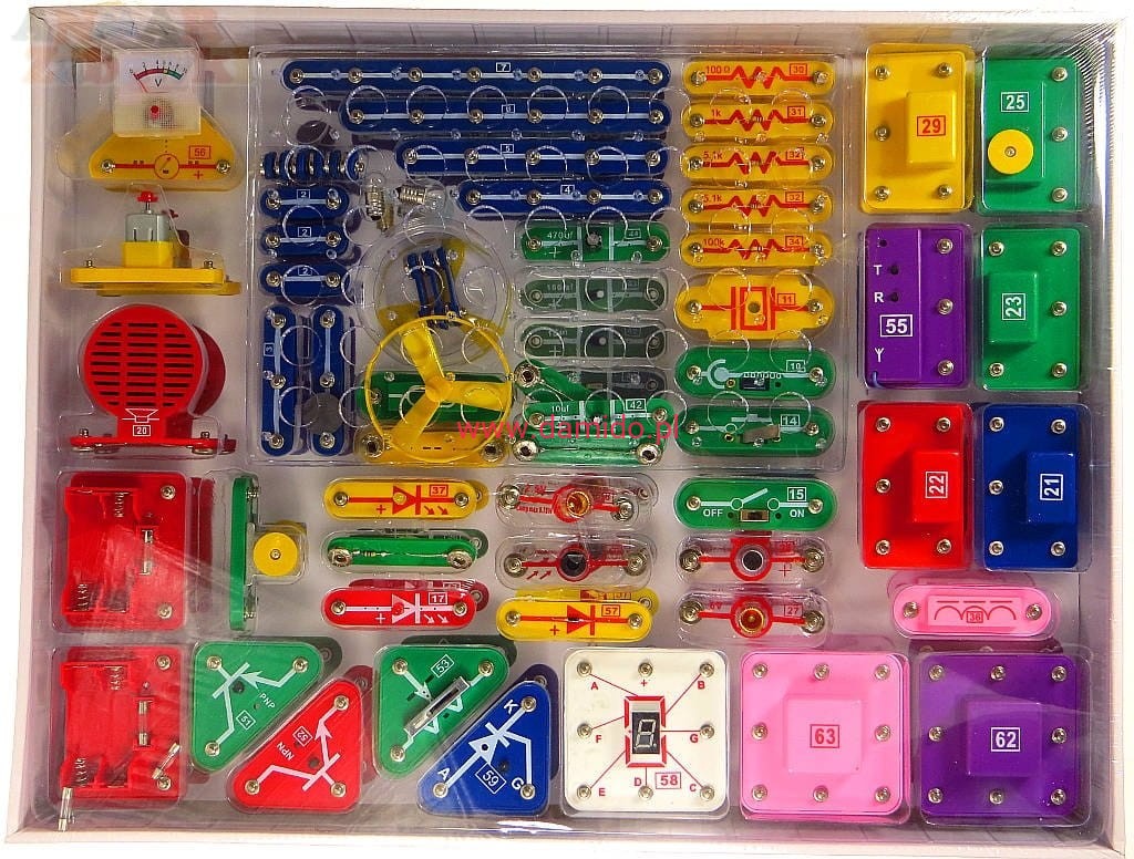 Wszystkie elementy wchodzące w skład zestawu są zaprojektowane w sposób umożliwiający ich łatwe i bezproblemowe łączenie za pomocą zaciskanych złączek. Na płycie montażowej łatwo i całkowicie bezpiecznie można zestawiać różne układy elektroniczne sterowane: magnesem, wodą, dotykiem, światłem, i dźwiękiem uzyskując efekty jak : błyskające żarówki, wentylatory napędzane silnikiem, latające śmigła, urządzenie, które po zapadnięciu zmroku włącza światło i mnóstwo efektów dźwiękowych.