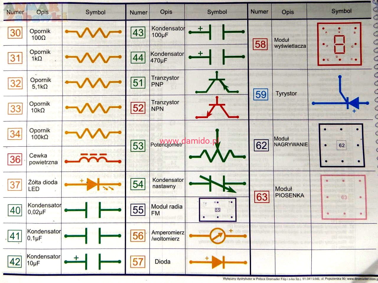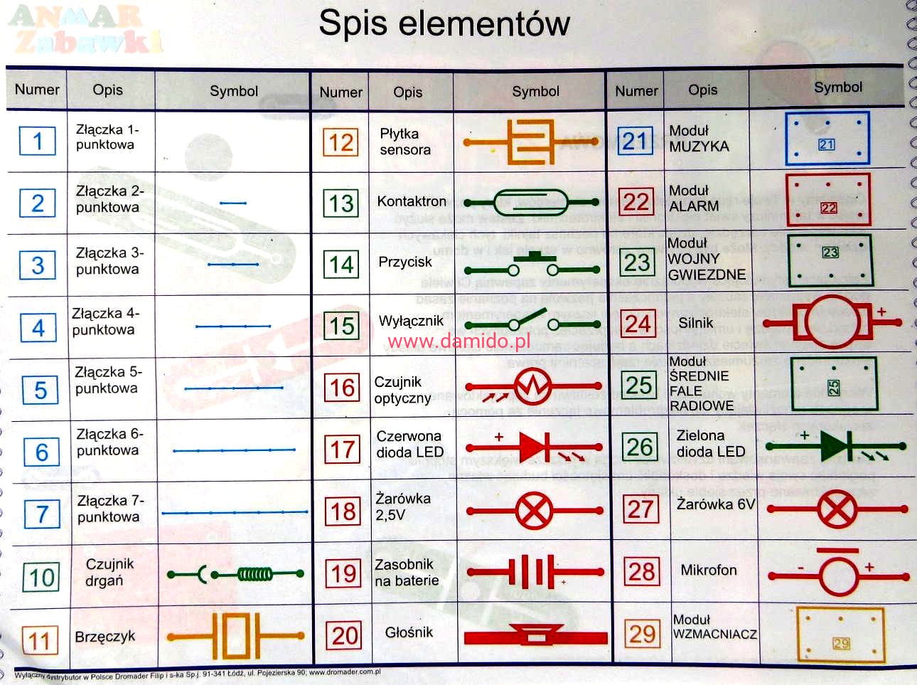 W zestawie znajdują się : płytka montażowa, złączki, płytka sensora, siniki, przełączniki, źródła światła, moduły dźwiękowe, moduł radiowy MW i FM, rezystory, zasobnik na baterie, głośnik, oporniki, kondensatory, tyrystory, rejestrator dźwięku i wyświetlacze cyfrowe.