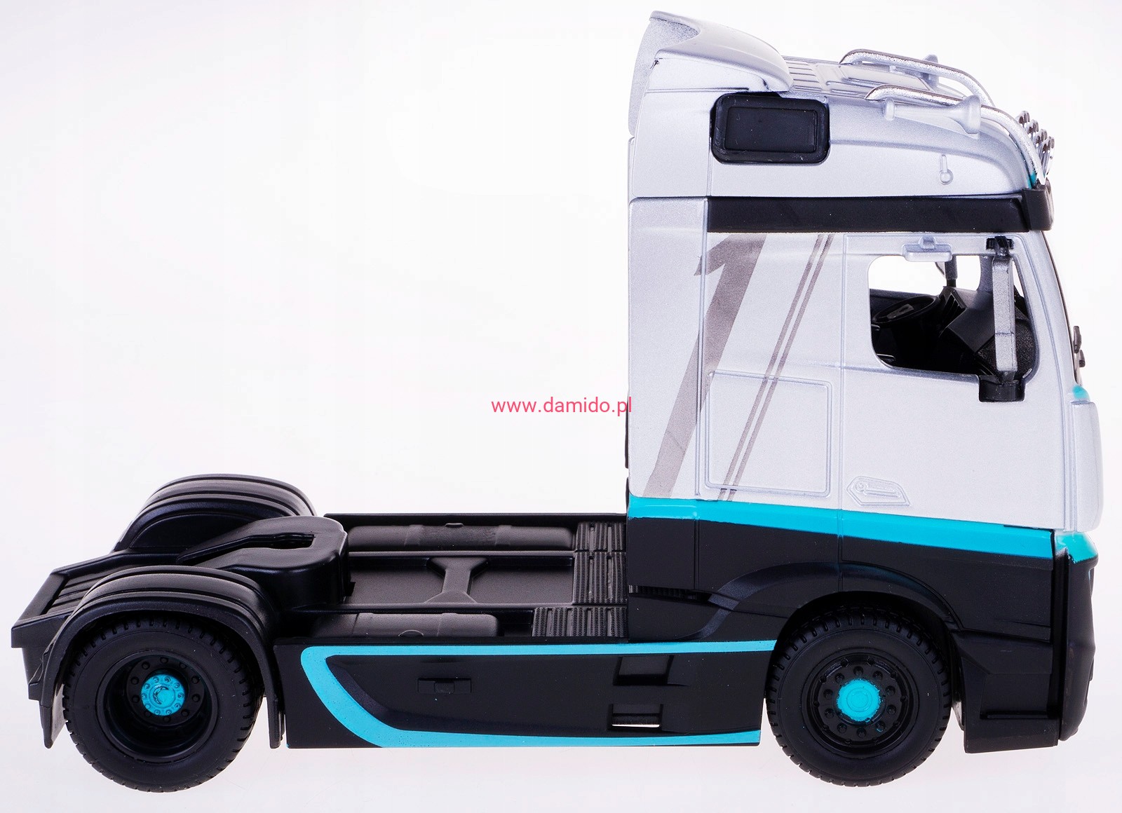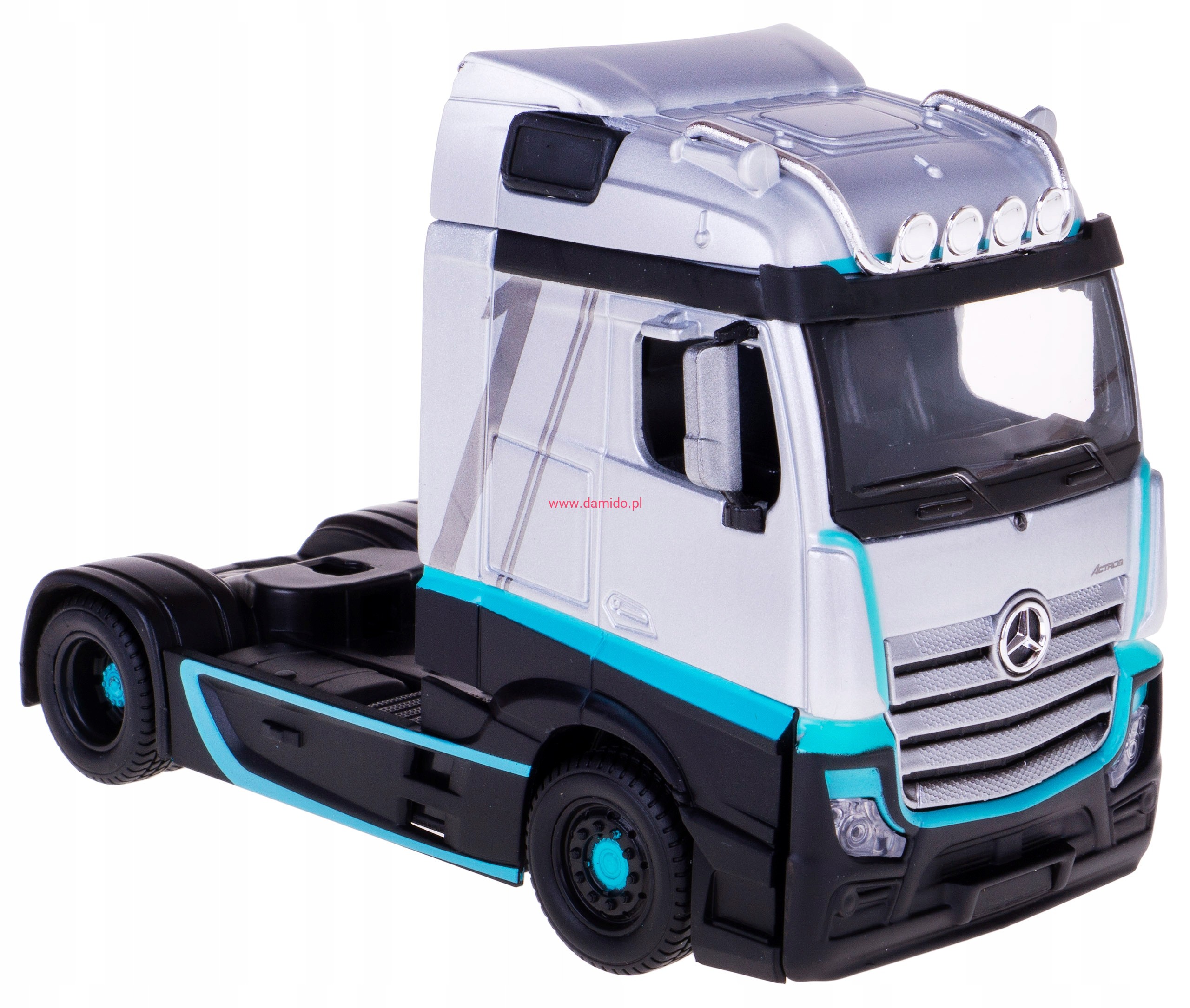 Model ciągnika siodłowego MERCEDES-BENZ ACTROS wykonany jest z metalu z dodatkiem plastiku i gumowymi oponami.
