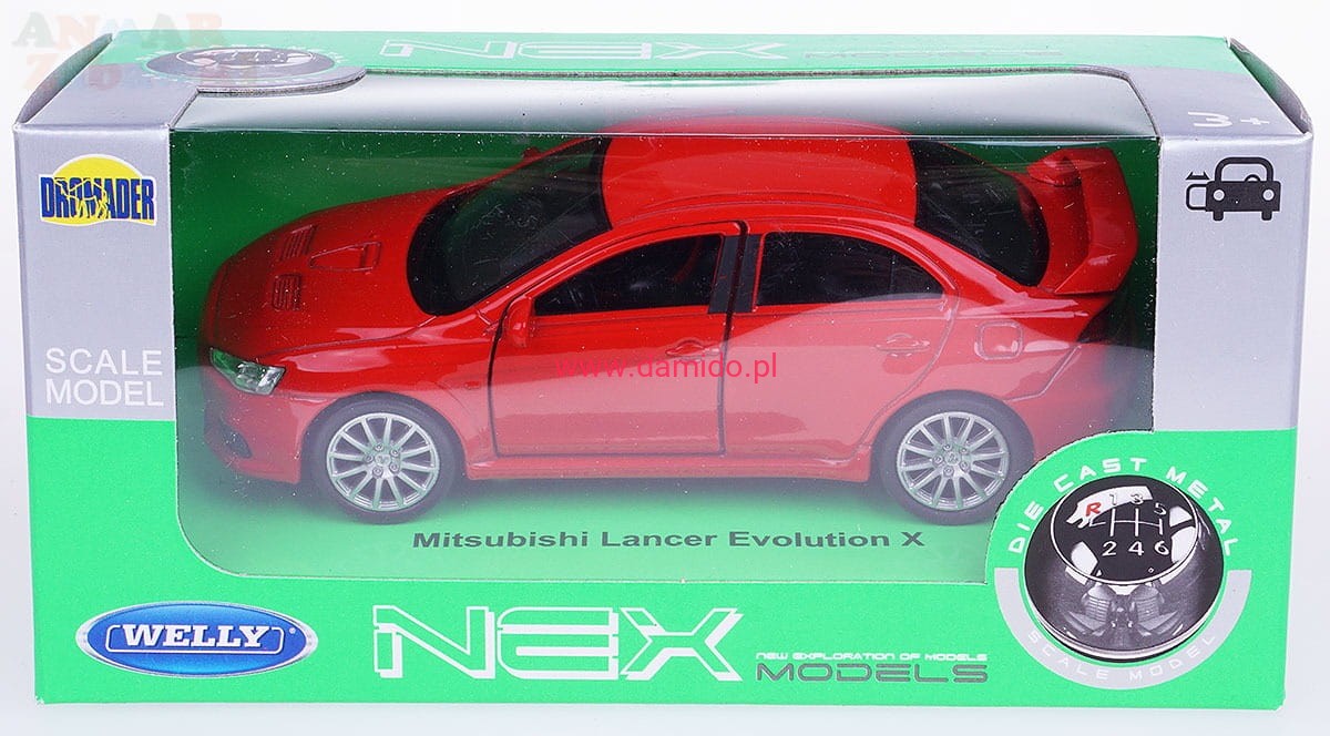 Model MITSUBISHI LANCER EVOLUTION X wykonany jest w skali 1:34 firmy WELLY.