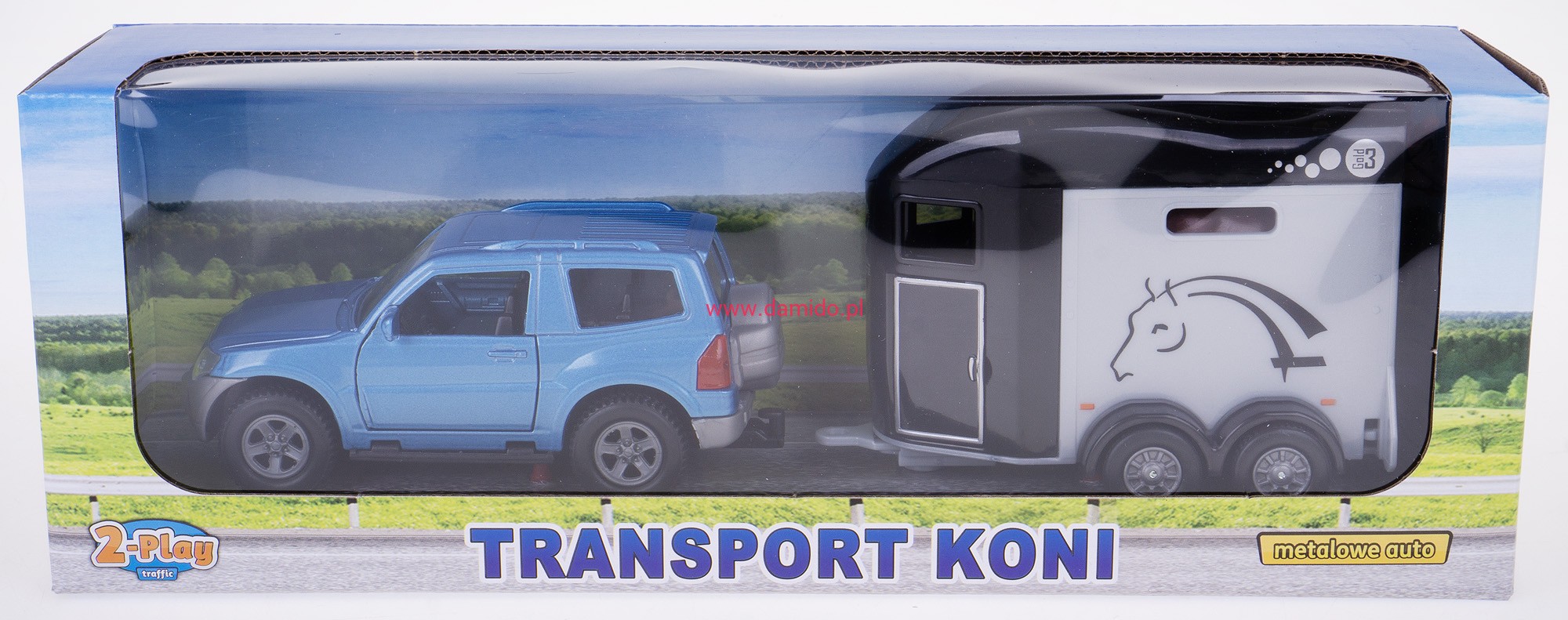 MITSUBISHI PAJERO METAL 1:32 + PRZYCZEPKA Z KOŃMI NIEBIESKI HY0005
