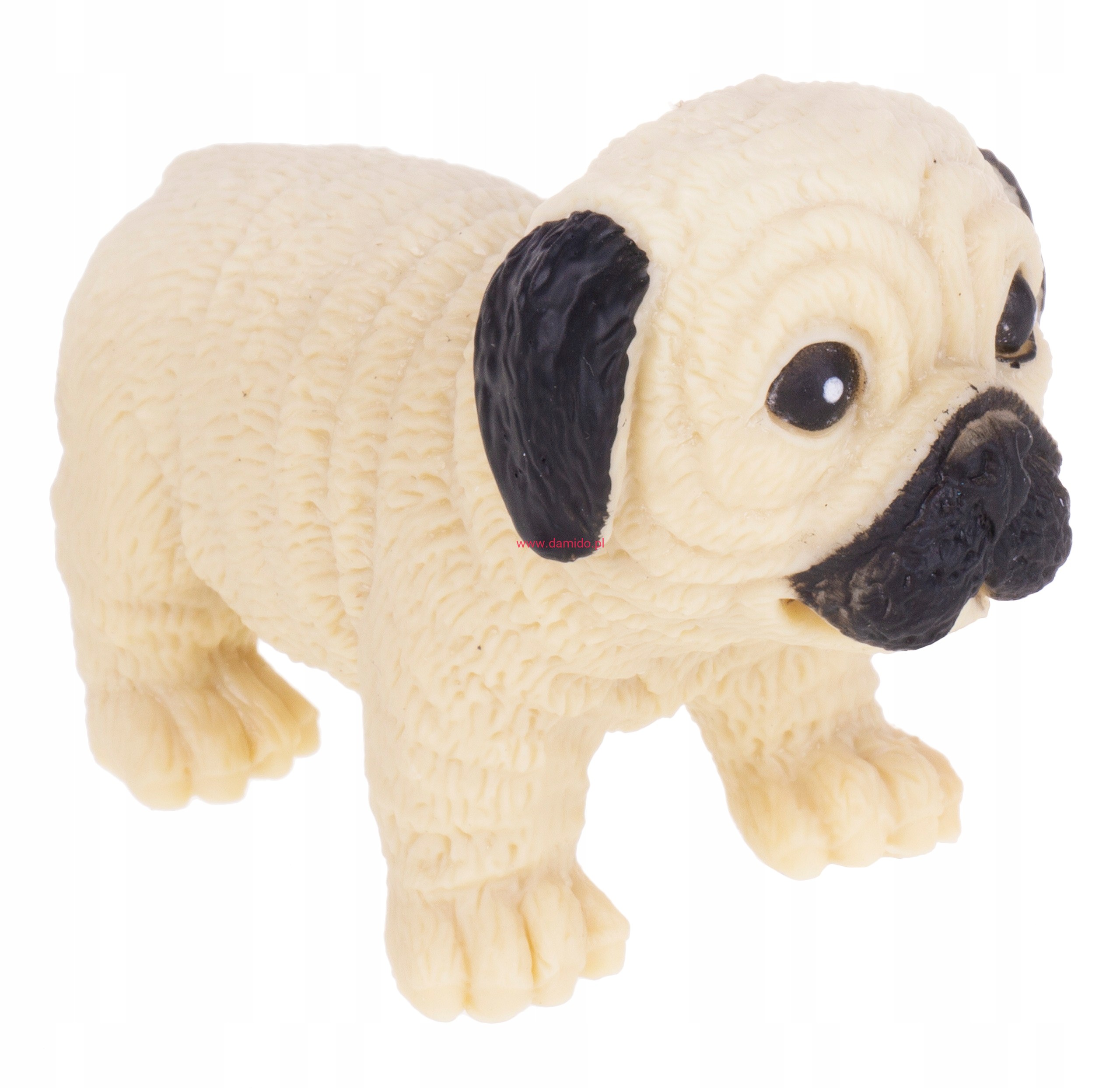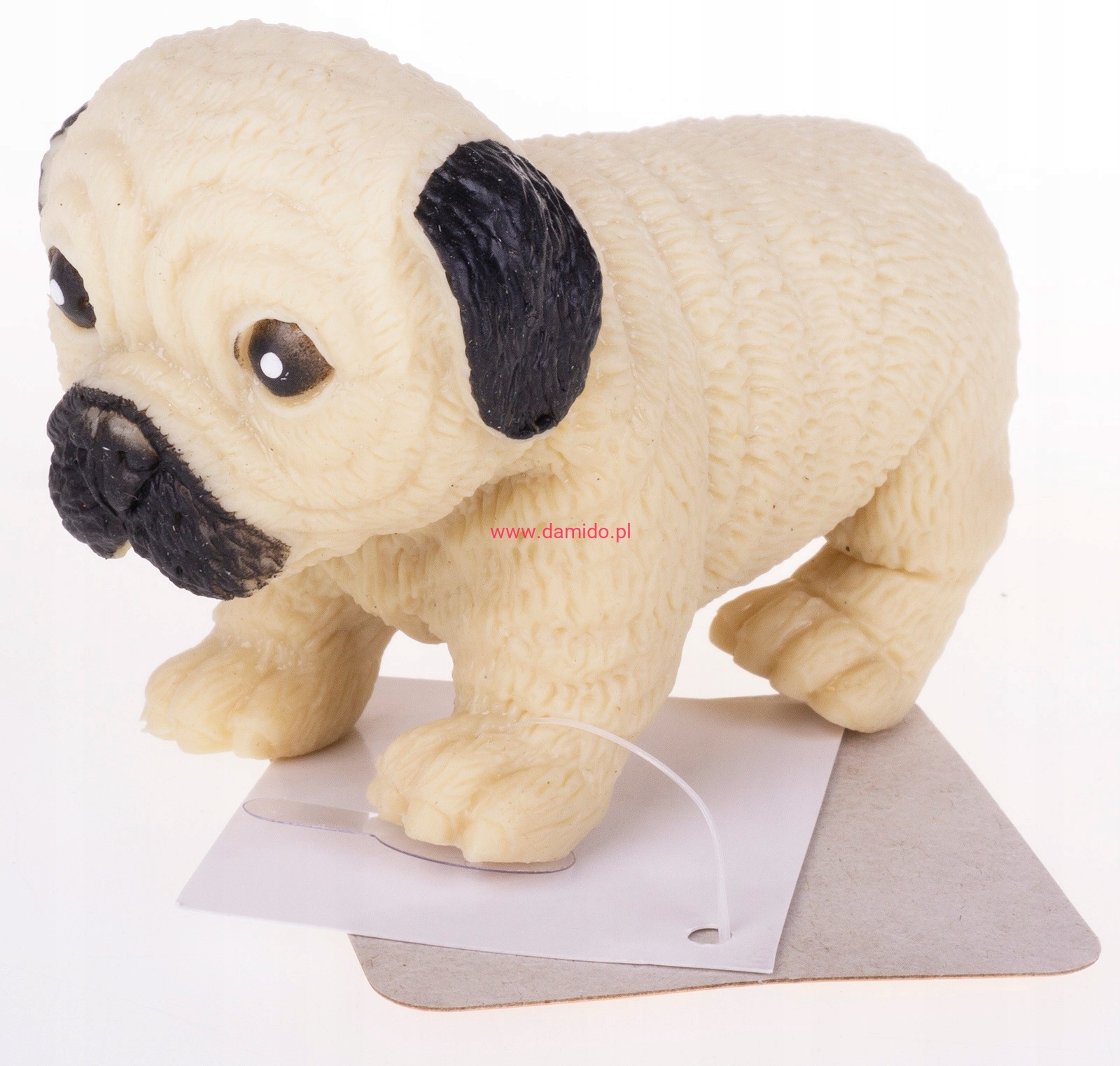 Śliczny gumowy elastyczny buldog, wyglądający jak prawdziwy, sprawi wiele radości podczas zabawy.
