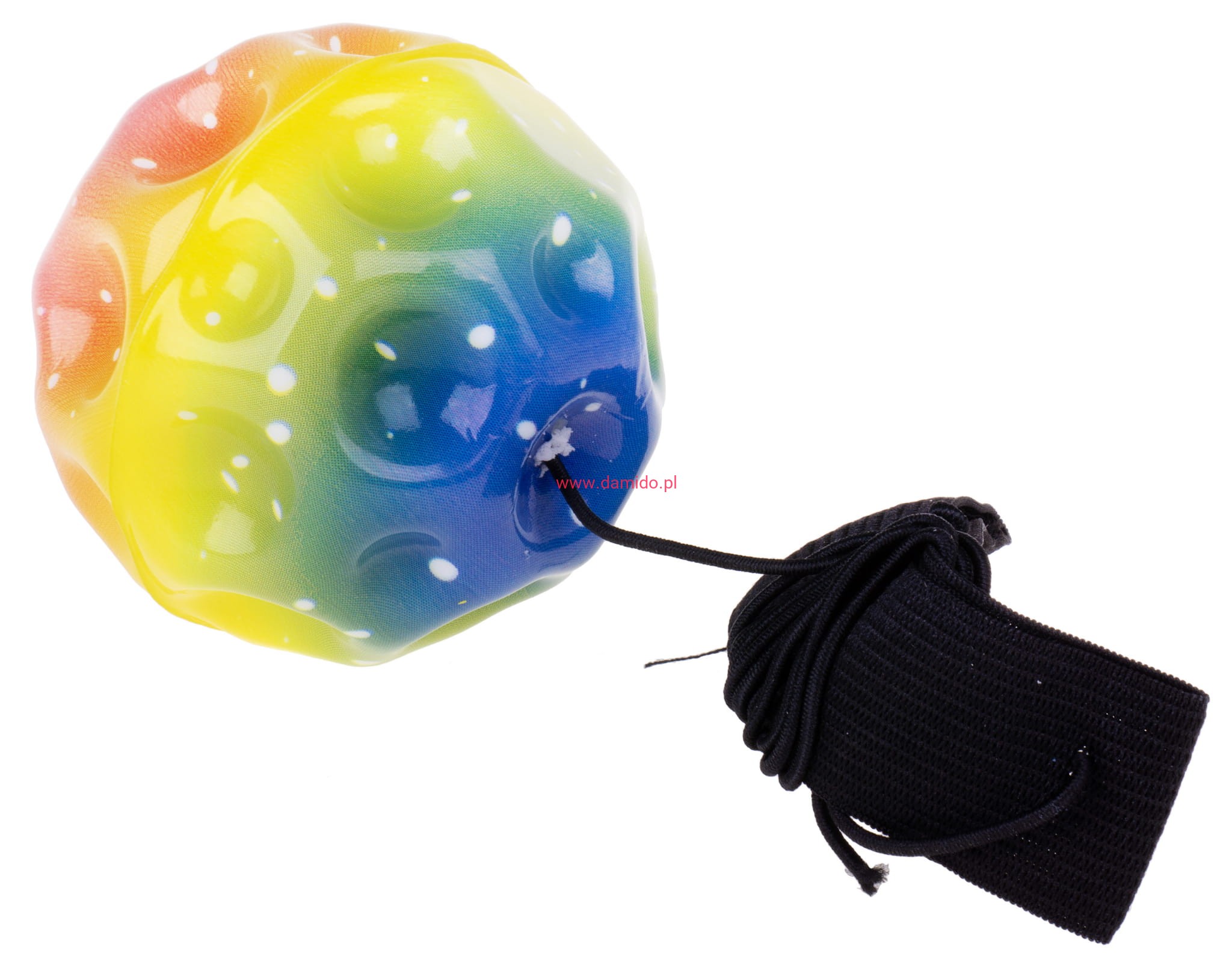 Gumowa piłeczka wyposażona jest w elastyczną gumkę z opaską zapinaną na rzep, dzięki temu możemy przyczepić ją na nadgarstek lub nogę.