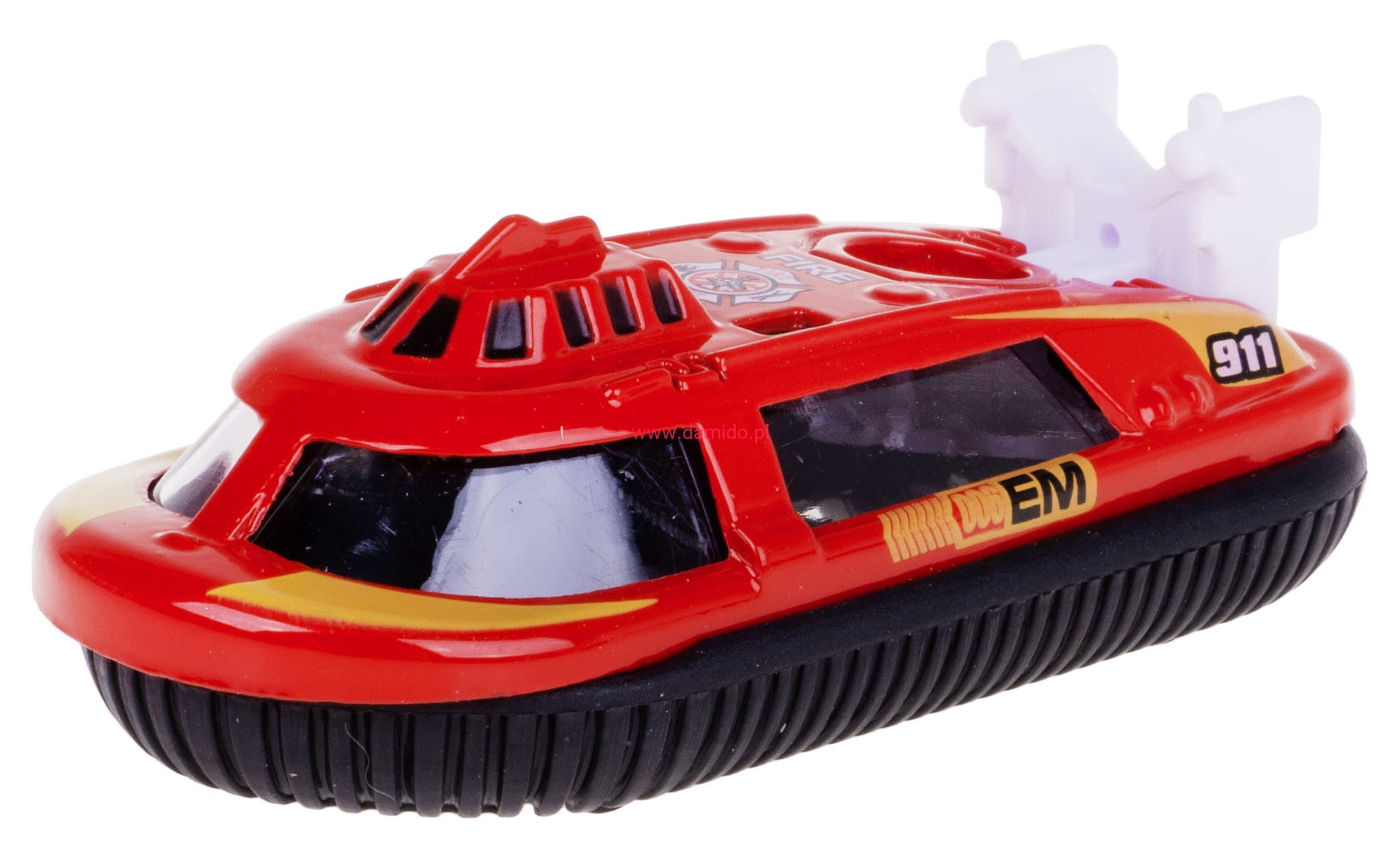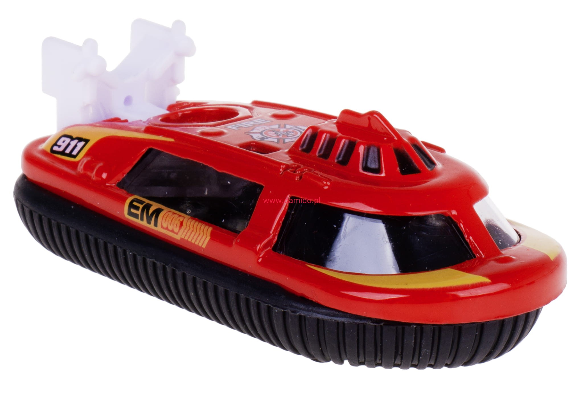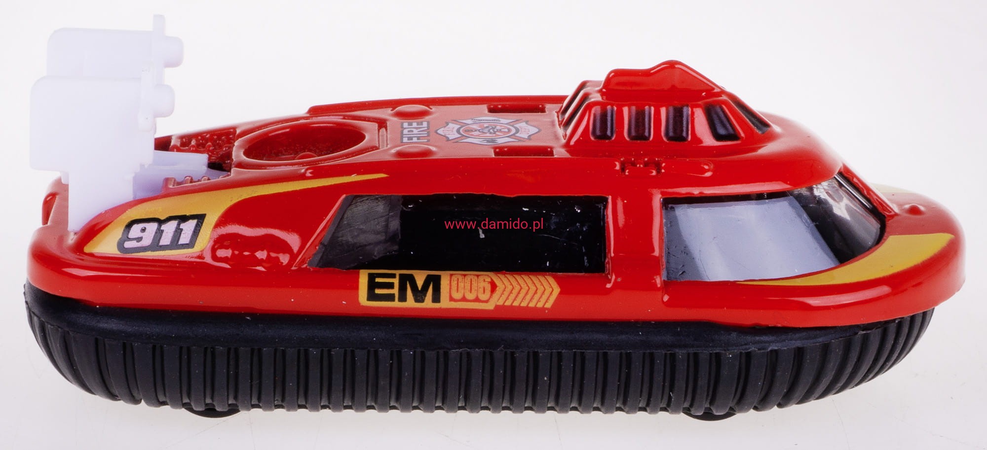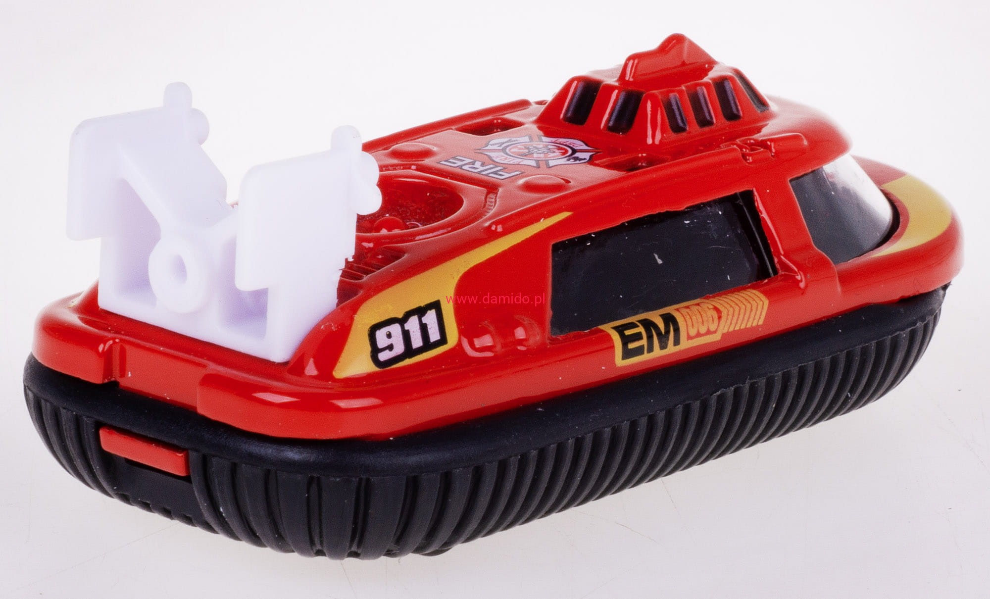 Poduszkowiec straży pożarnej resorak w skali 1:64 o długości ok.7,3 cm wykonany z metalu i plastiku.