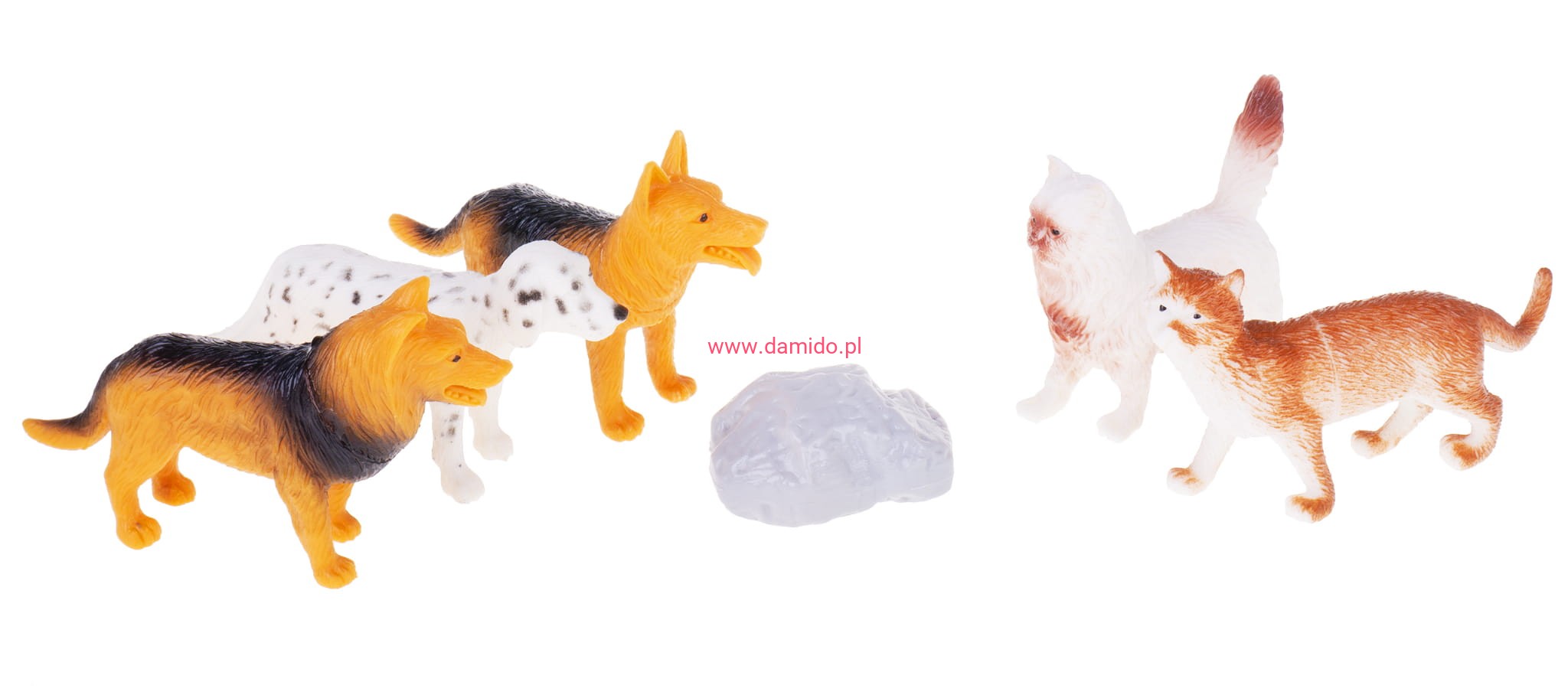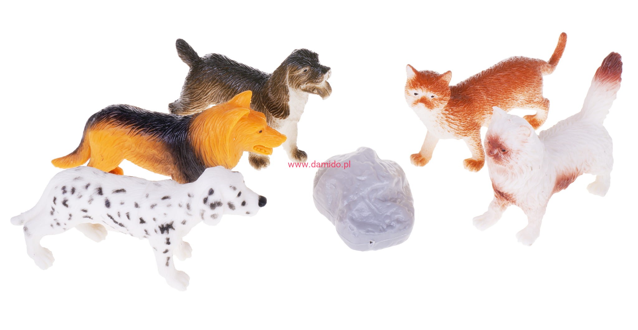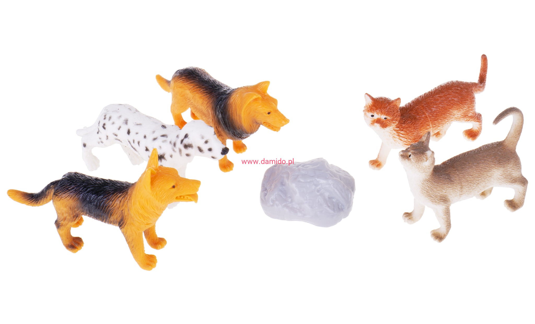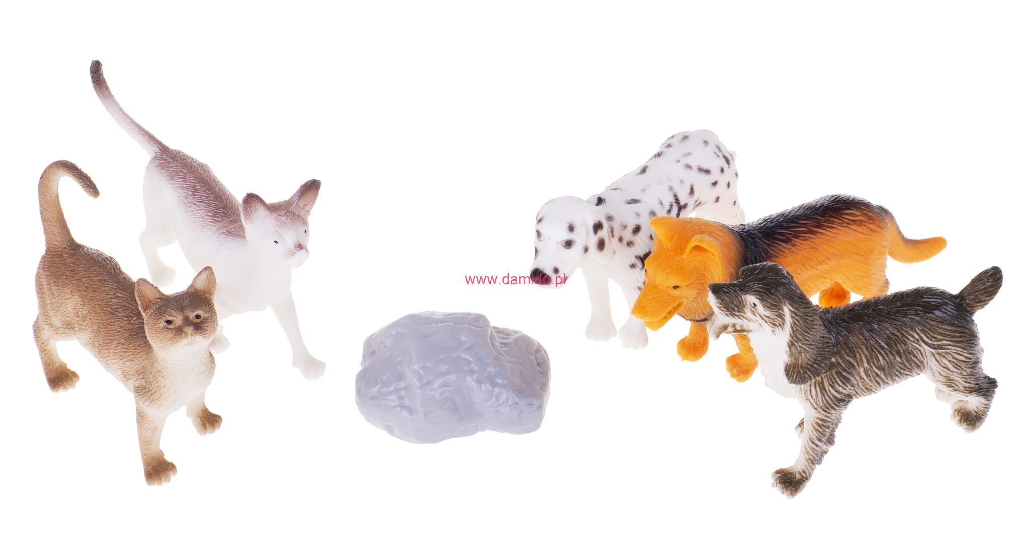 Zestaw składa się z 5 sztuk wiernie odzwierciedlonych figurek piesków i figurek kotków oraz imitacji skały.