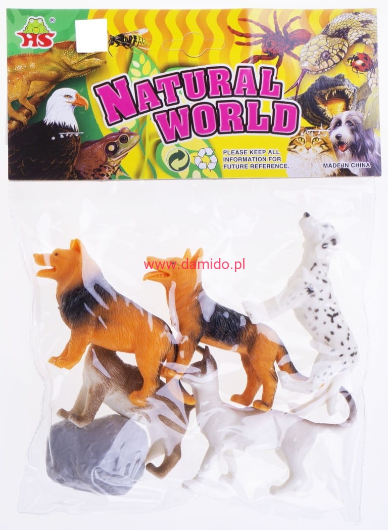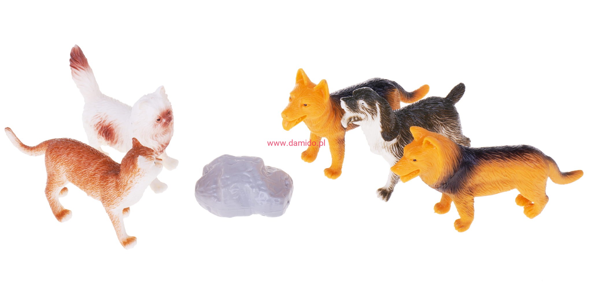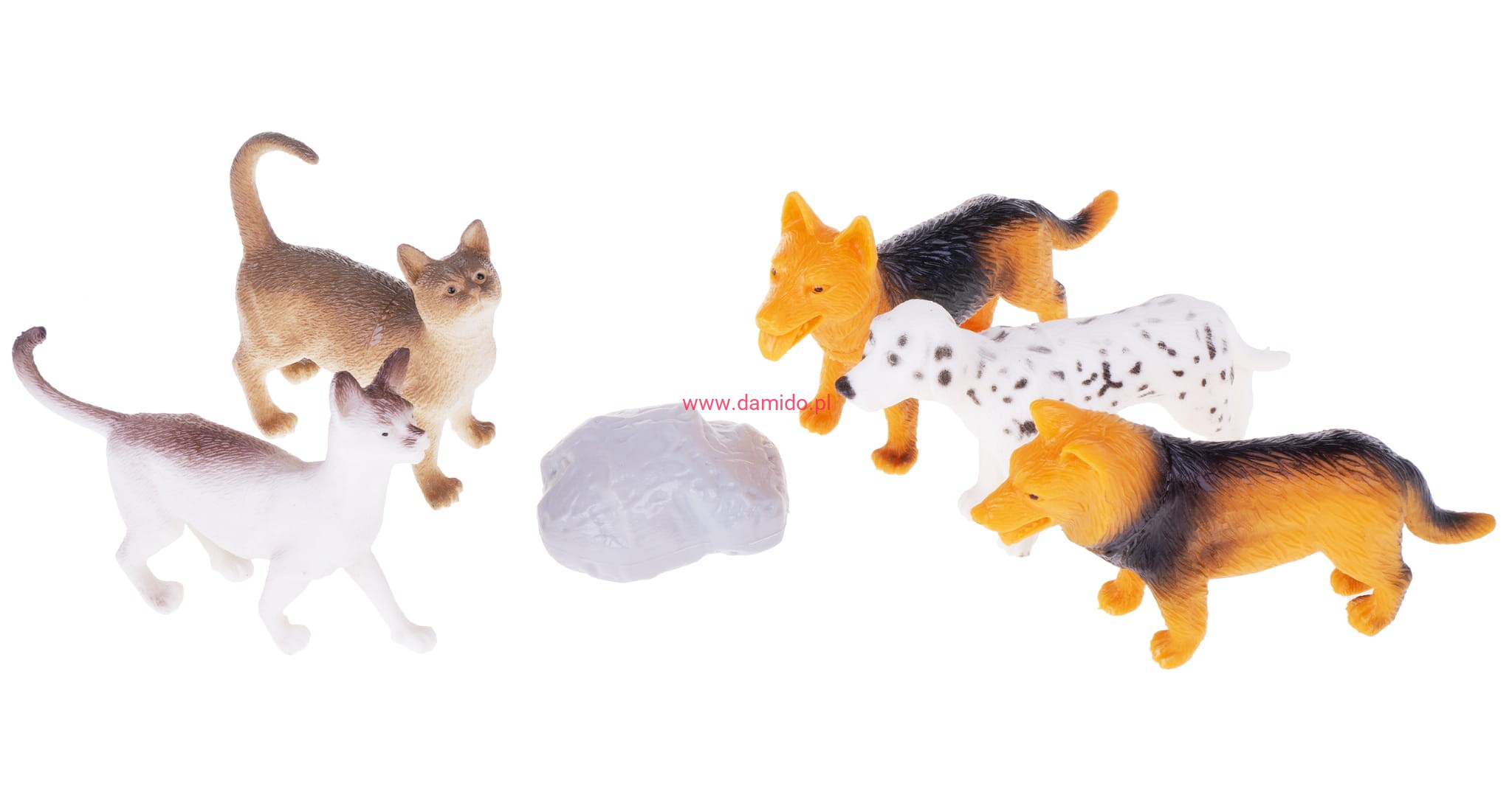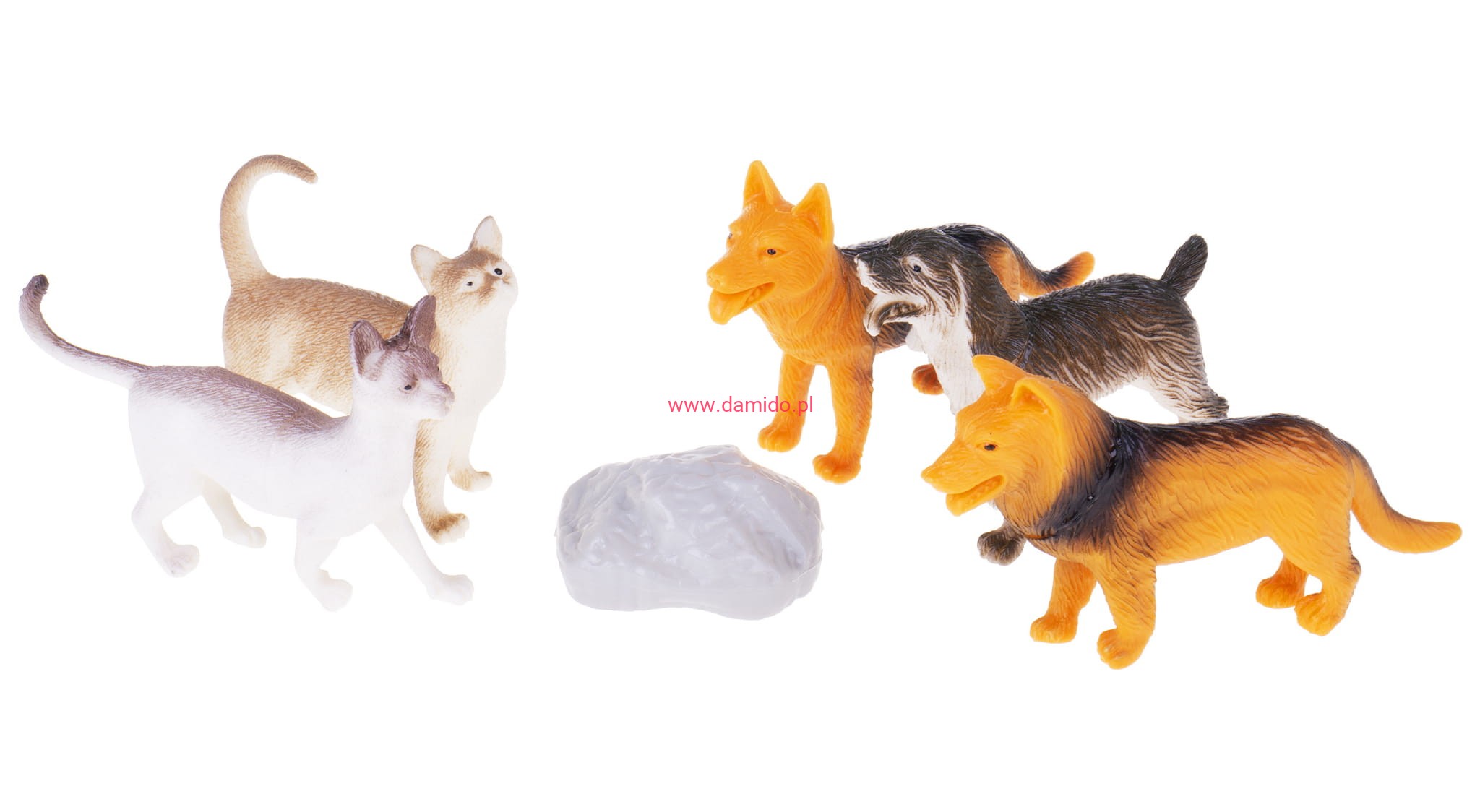 Zestaw składa się z 5 sztuk wiernie odzwierciedlonych figurek piesków i figurek kotków oraz imitacji skały.
