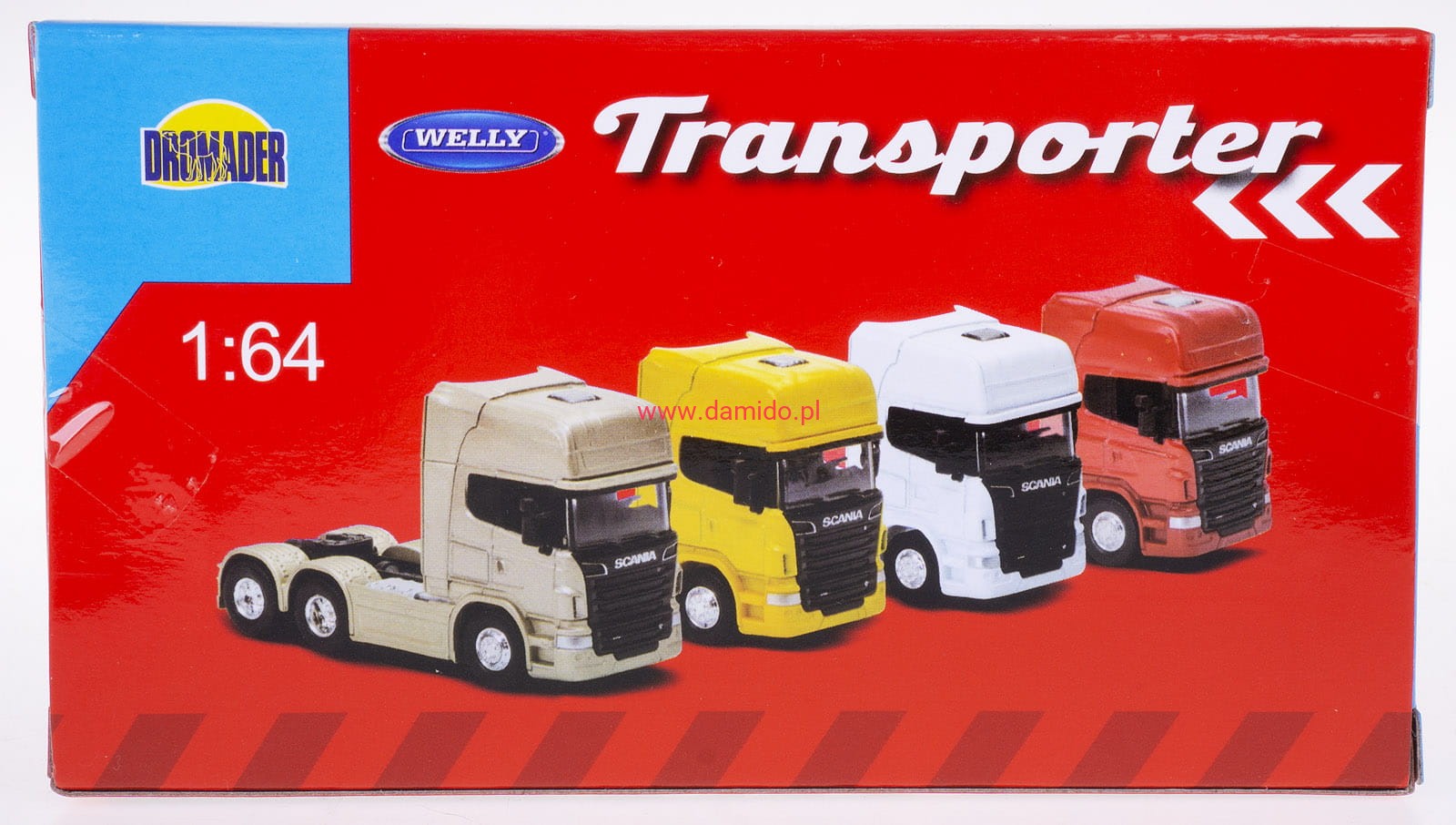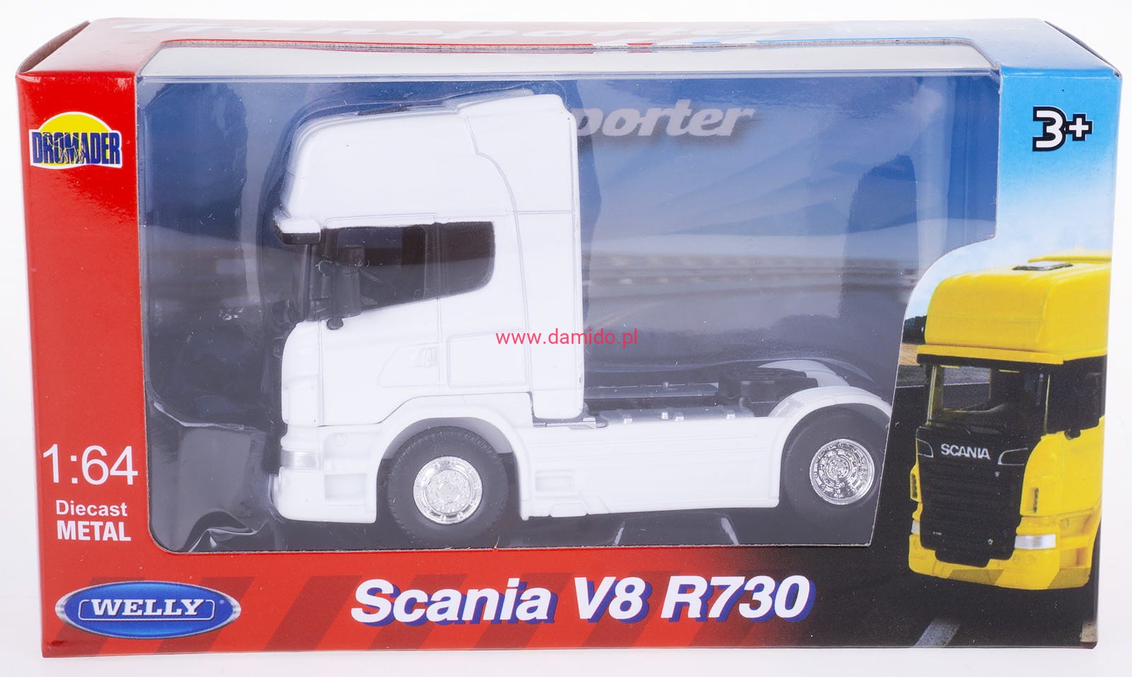 Model ciągnika SCANIA V8 R730 wykonany jest w skali 1:64 firmy WELLY.
