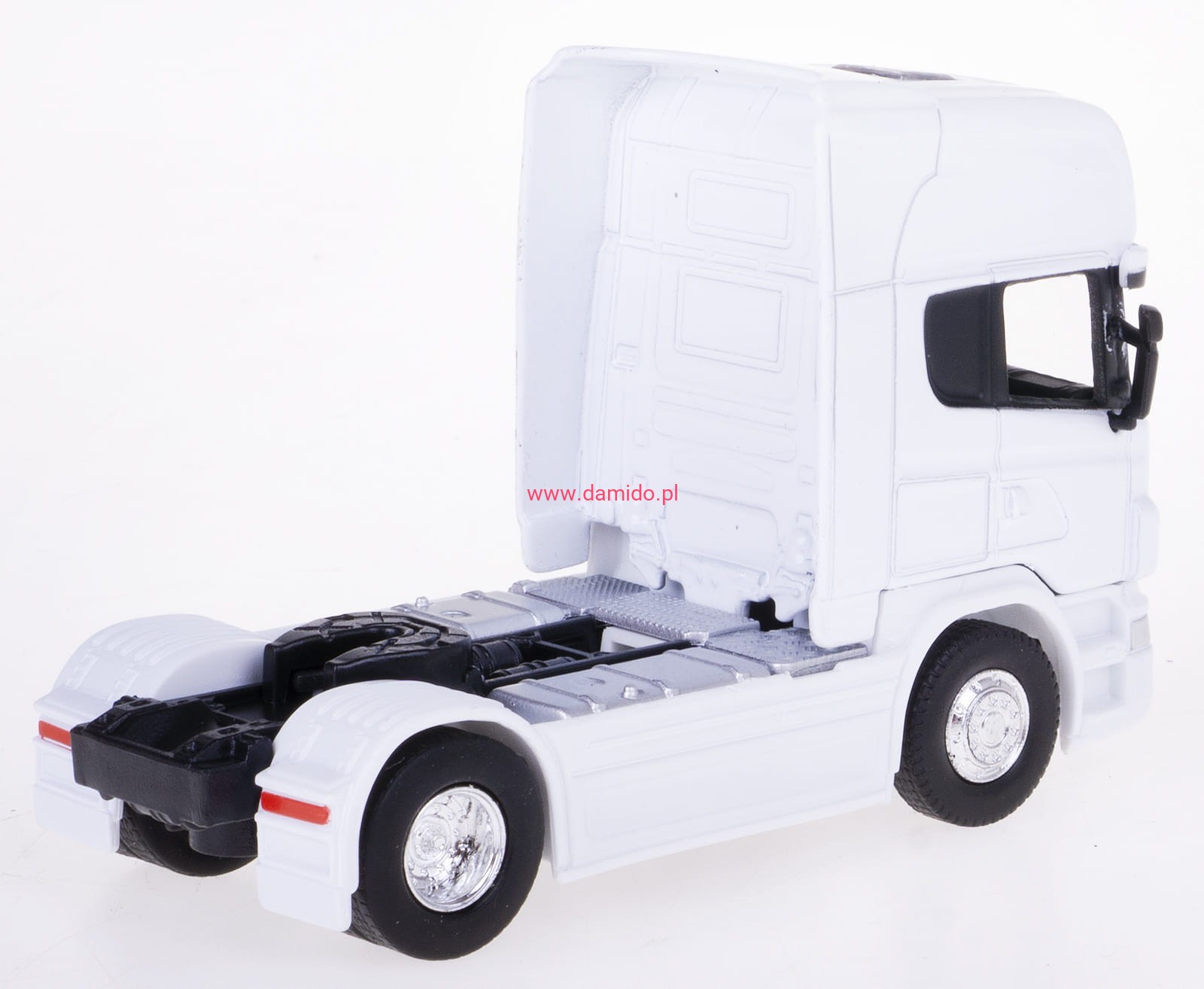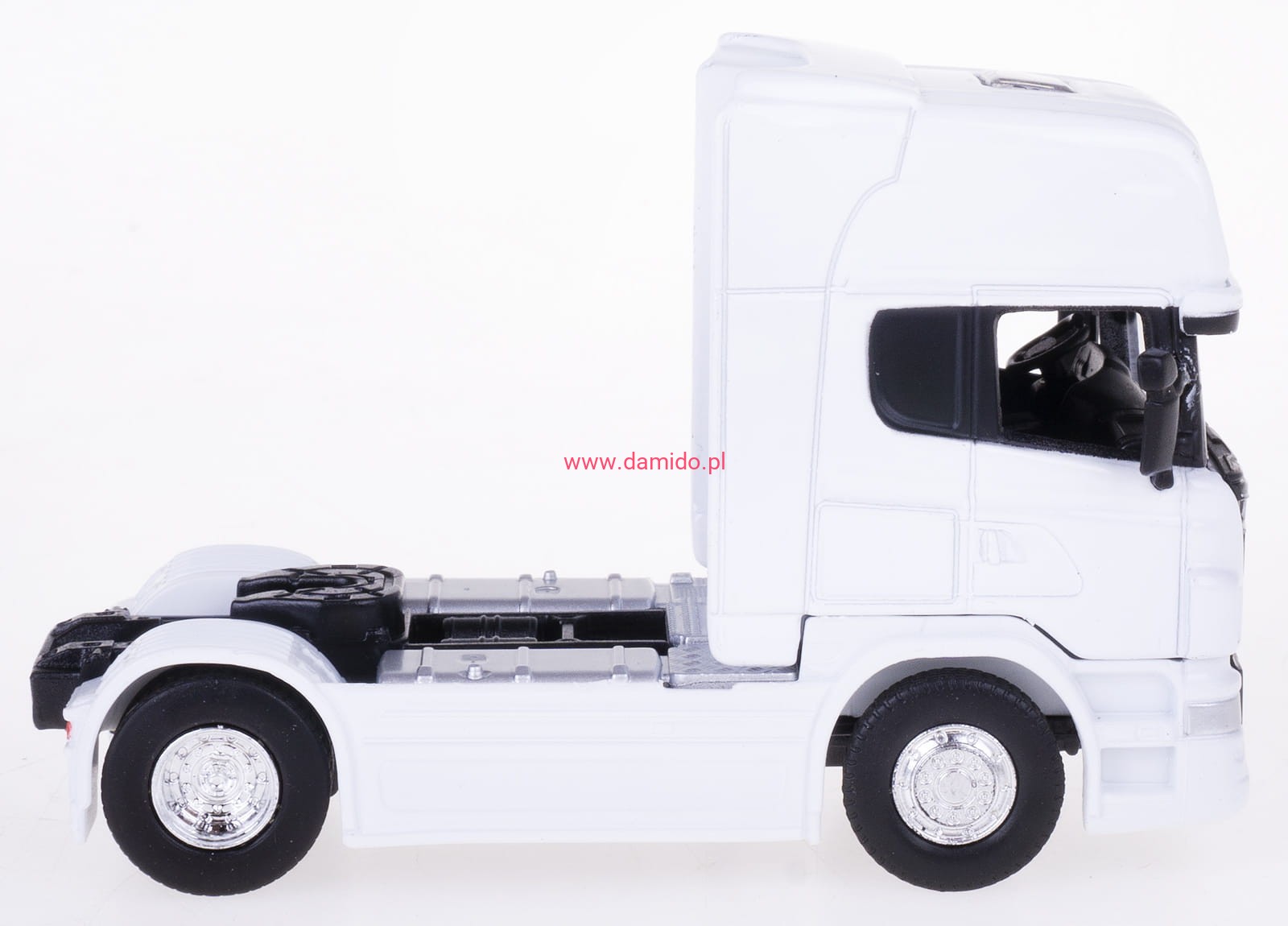 Model ciągnika siodłowego SCANIA V8 R730 wykonany jest z metalu i elementów plastikowych na gumowych oponach.