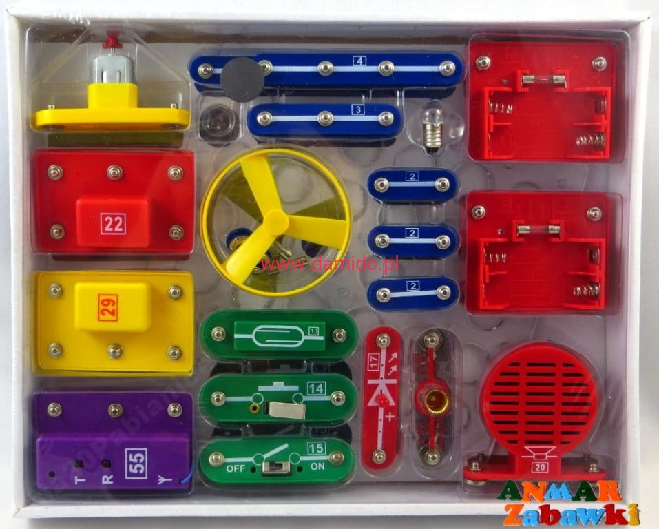 Wszystkie elementy wchodzące w skład zestawu są zaprojektowane w sposób umożliwiający ich łatwe i bezproblemowe łączenie za pomocą zaciskanych złączek. Na płycie montażowej łatwo i całkowicie bezpiecznie można zestawiać różne układy elektroniczne sterowane: magnesem, wodą, dotykiem, światłem, i dźwiękiem uzyskując efekty jak : błyskające żarówki, wentylatory napędzane silnikiem, latające śmigła, urządzenie, które po zapadnięciu zmroku włącza światło i mnóstwo efektów dźwiękowych.