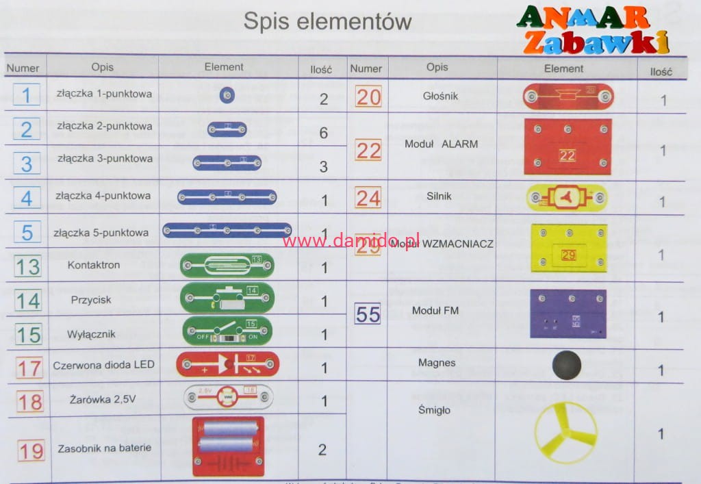 W zestawie znajdują się : płytka montażowa, złączki, sinik, przycisk, wyłącznik, kontaktron, źródła światła,czerwona dioda led , zasobnik na baterie, głośnik, moduł alarm, moduł wzmacniacz ,moduł FM, śmigło, magnes.