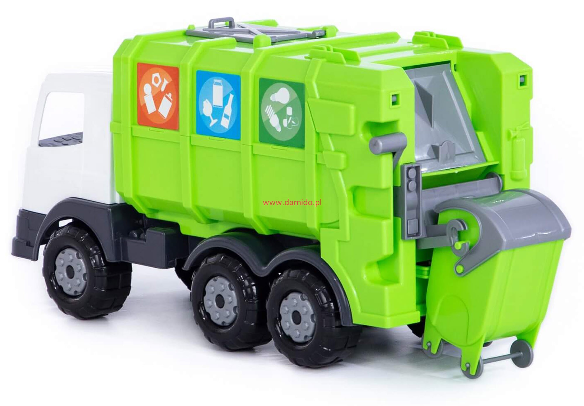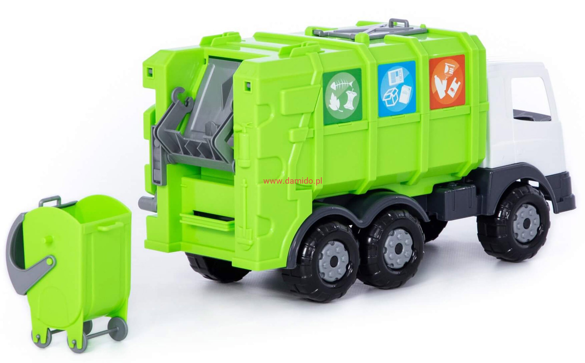 W zestawie ze śmieciarką dołączony został kosz na kółkach – umożliwia opróżnianie go do śmieciarki za pomocą specjalnej dźwigni, z boku autka co na świetną zabawę.