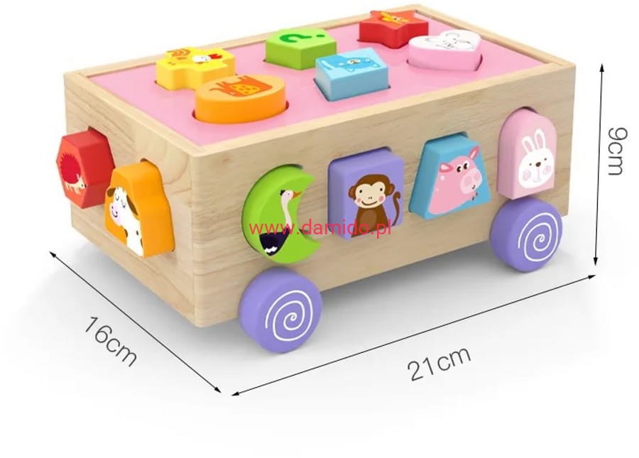 Zapewnij swojemu dziecku edukacyjną zabawę i rozwijaj jego umiejętności poznawcze i motoryczne dzięki uroczemu drewnianemu sorterowi klocków. Sorter został wykonany z drewna, natomiast klocki zostały starannie zaprojektowane i wykonane tak, aby nie miały ostrych elementów, które mogłyby stanowić ryzyko dla maluchów. Dzięki zamontowanym 4 kolorowym kółkom, dziecko może swobodnie przesuwać sorter rączką po podłodze, co stanowi dodatkową formę zabawy. Sorter otwierany jest od góry, dzięki czemu można łatwo wyjąć z niej zawartość lub schować do środka również inne akcesoria, które stanowią części zabawki. Zabawka może również posłużyć jako miejsce do przechowywania innych przedmiotów a dodatkowo wyrobi nawyk sprzątania po skończonej zabawie.