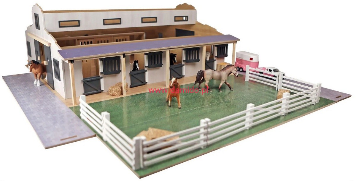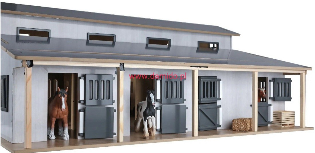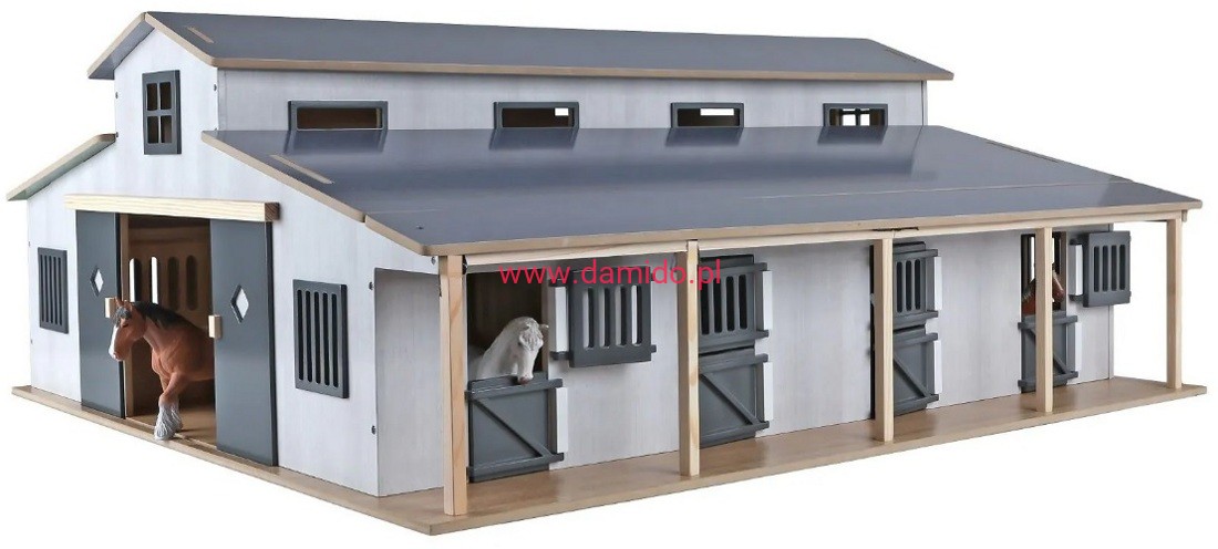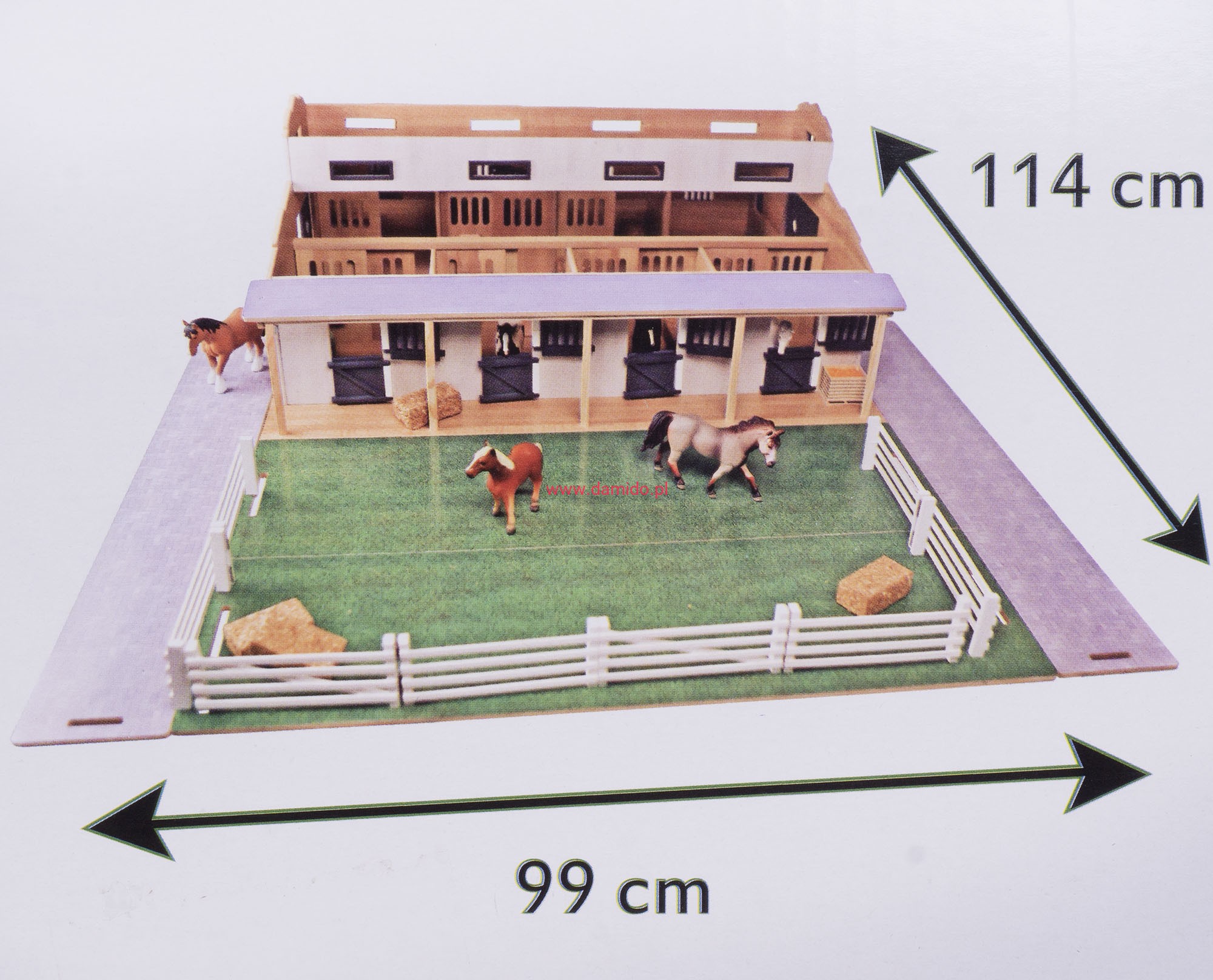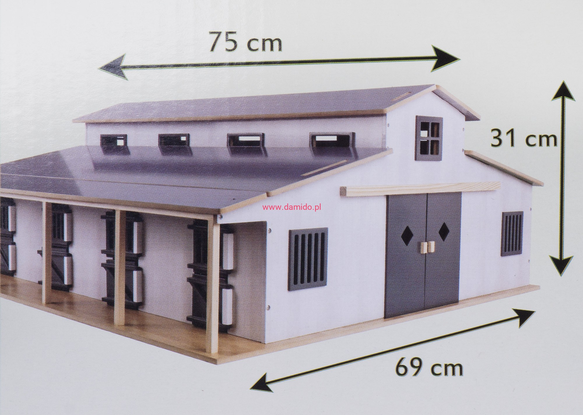 Duża drewniana stajnia wykonana została całkowicie z drewna i materiałów drewnopodobnych w skali 1:24. We wnętrzu posiada korytarz, aż 7 boksów dla koni oraz pomieszczenie gospodarcze.