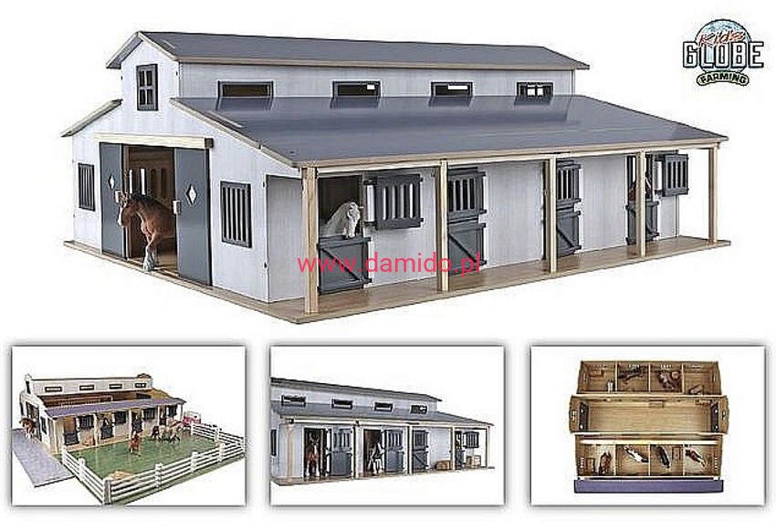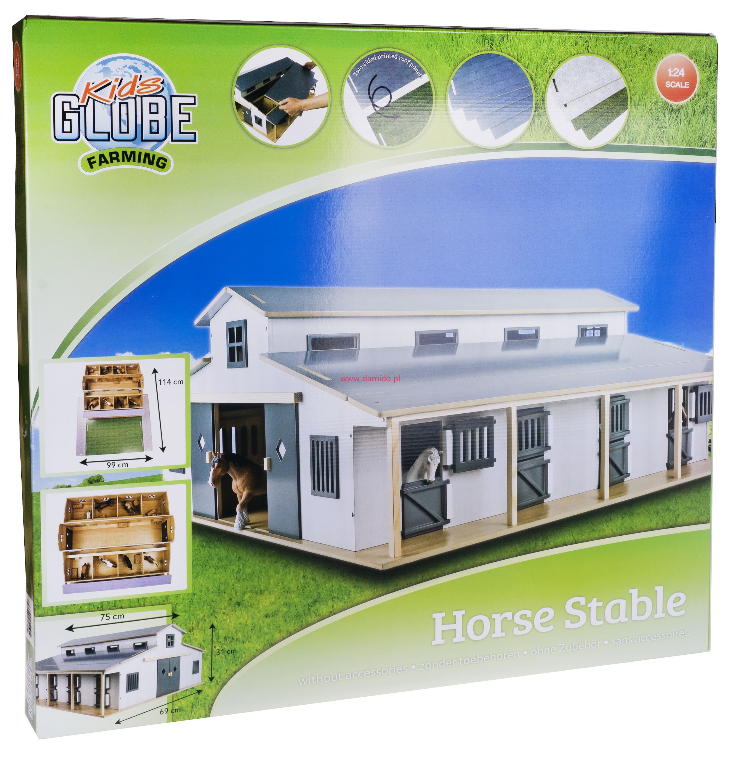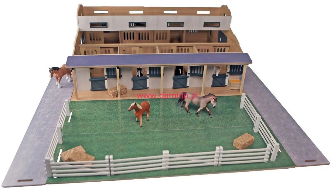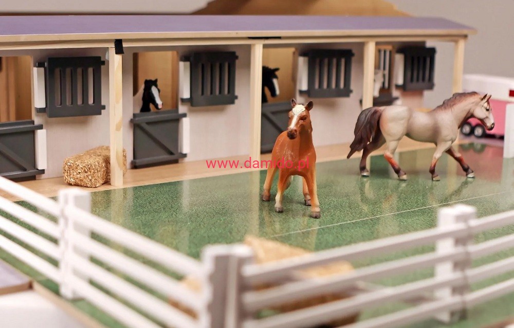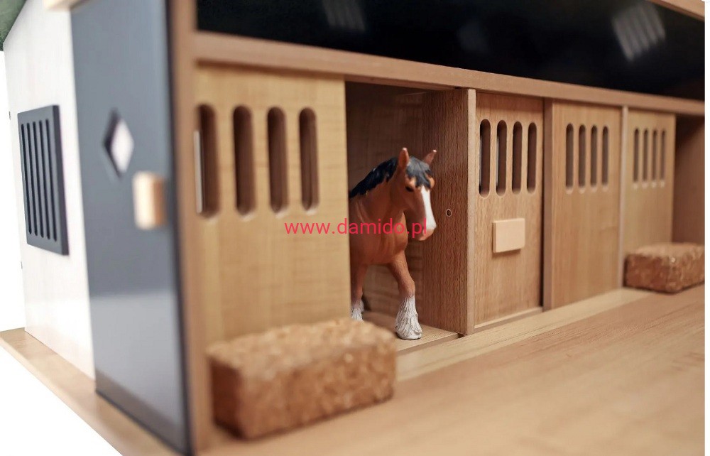 Duża drewniana stajnia wykonana została całkowicie z drewna i materiałów drewnopodobnych w skali 1:24. We wnętrzu posiada korytarz, aż 7 boksów dla koni oraz pomieszczenie gospodarcze.