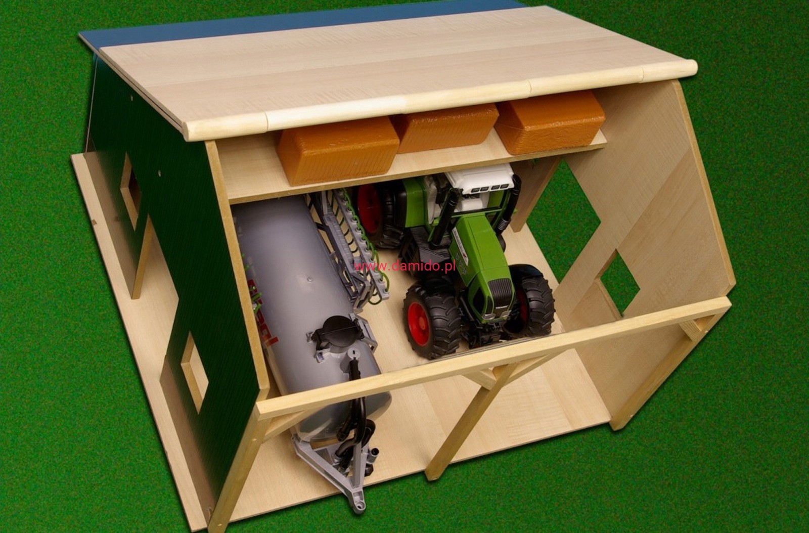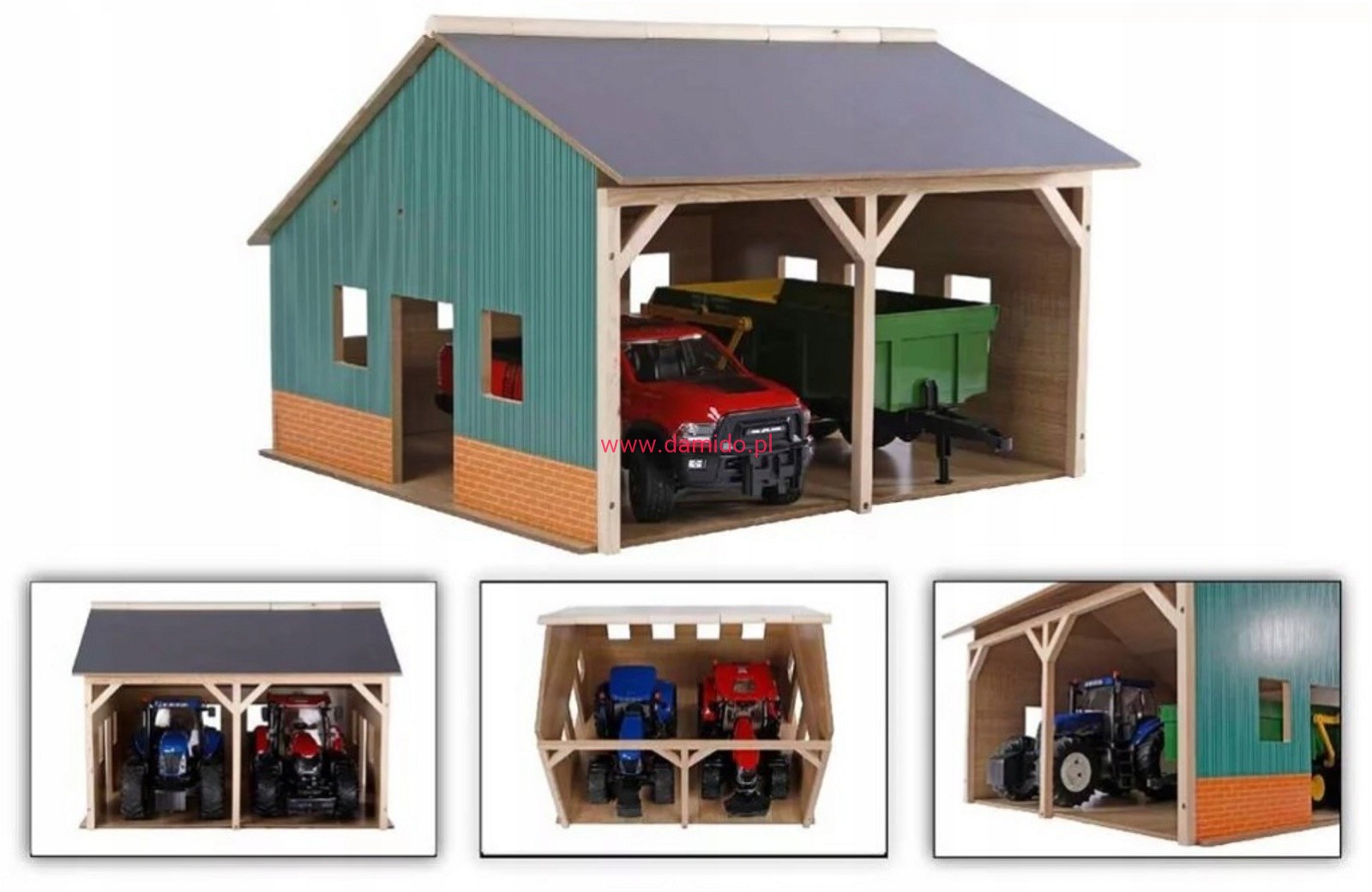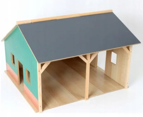 Drewniana wiata garaż z unoszonym dachem wykonany został całkowicie z drewna i materiałów drewnopodobnych w skali 1:16, wygląda bardzo realistycznie.We wnętrzu posiada aż dwa stanowiska na duże traktory lub ulubione autka.