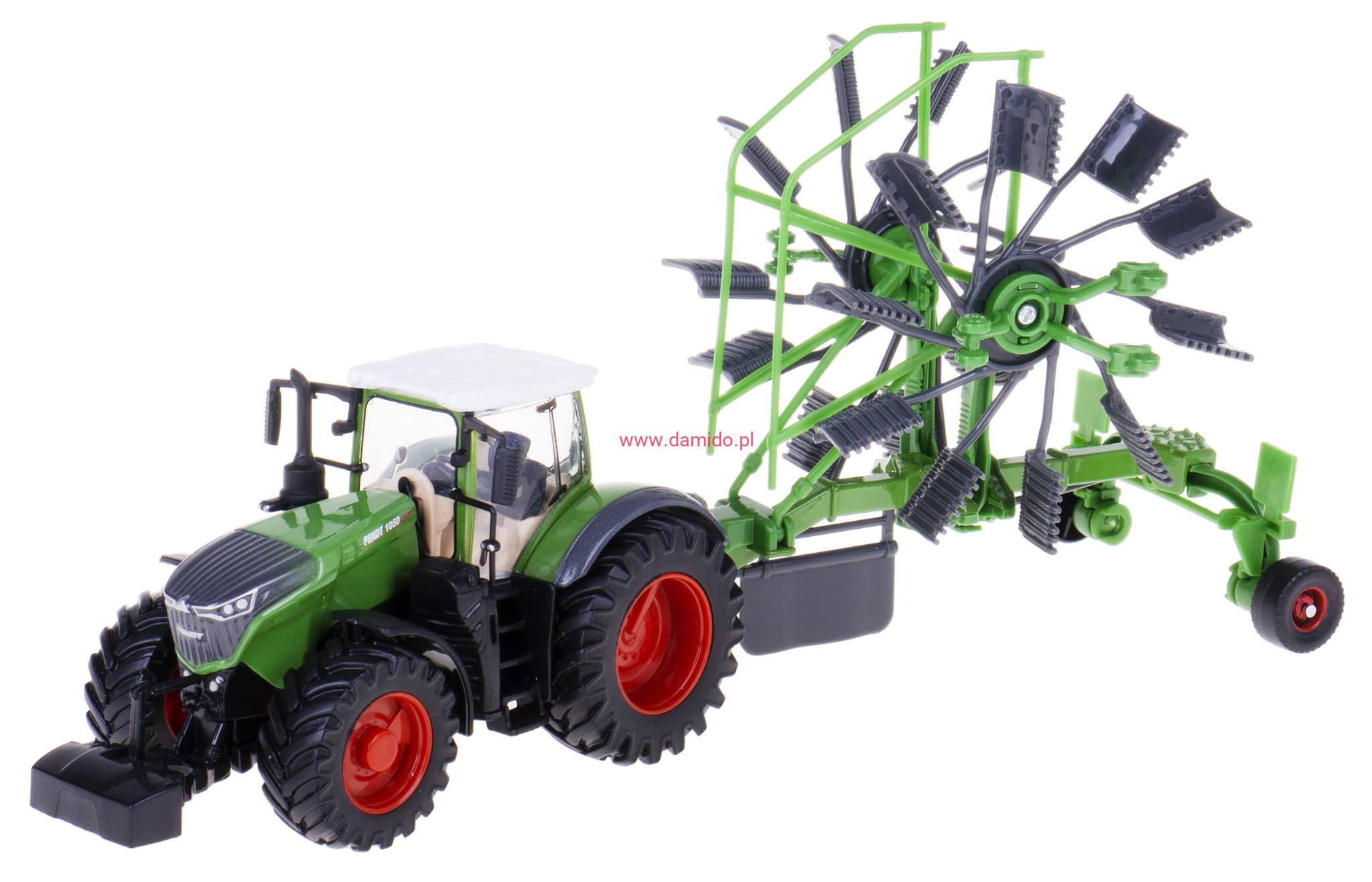 Traktor posiada tylny zaczep, do którego możemy doczepić załączone akcesoria jak zgrabiarka karuzelowa,
