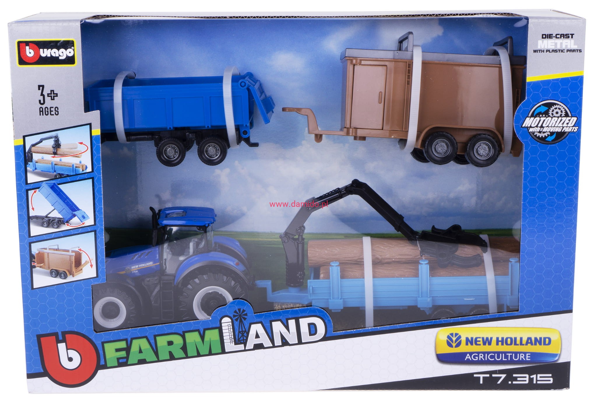 TRAKTOR NEW HOLLAND T7.315 + 3 PRZYCZEPKI METAL PLASTIK BBURAGO 31668