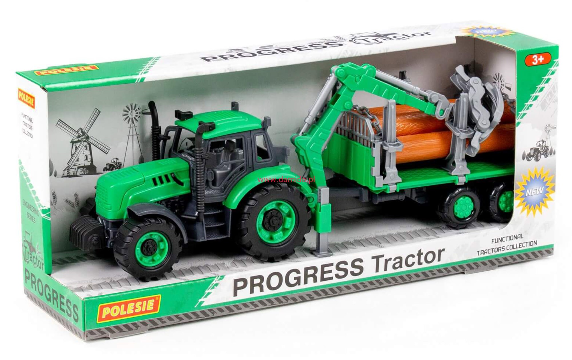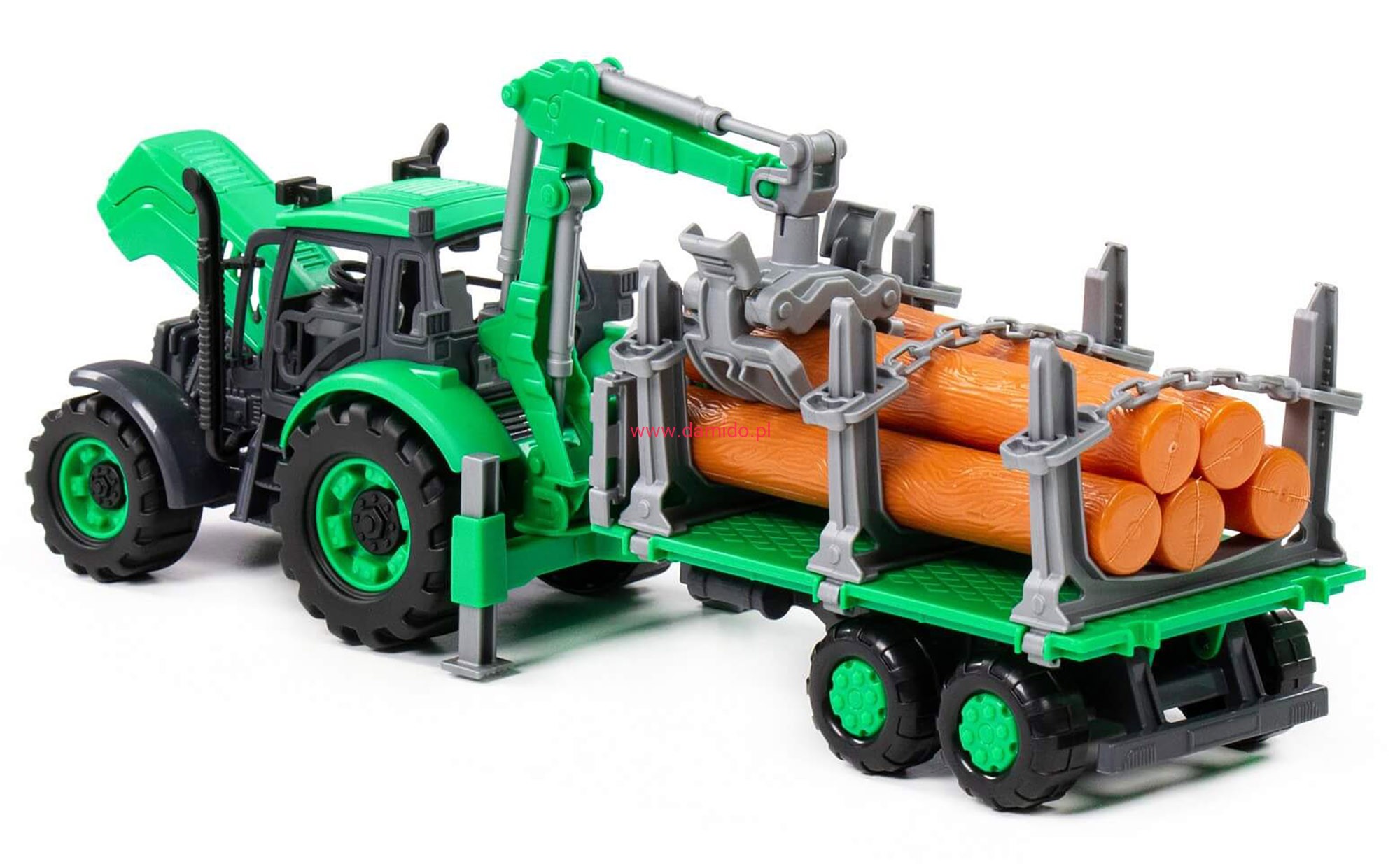 Do traktora dołączona została przyczepa do przewozu drewna. Łańcuchy na przyczepie można ściągnąć, co pozwala na przewożenie większych ładunków i zwiększa funkcjonalność zabawki.