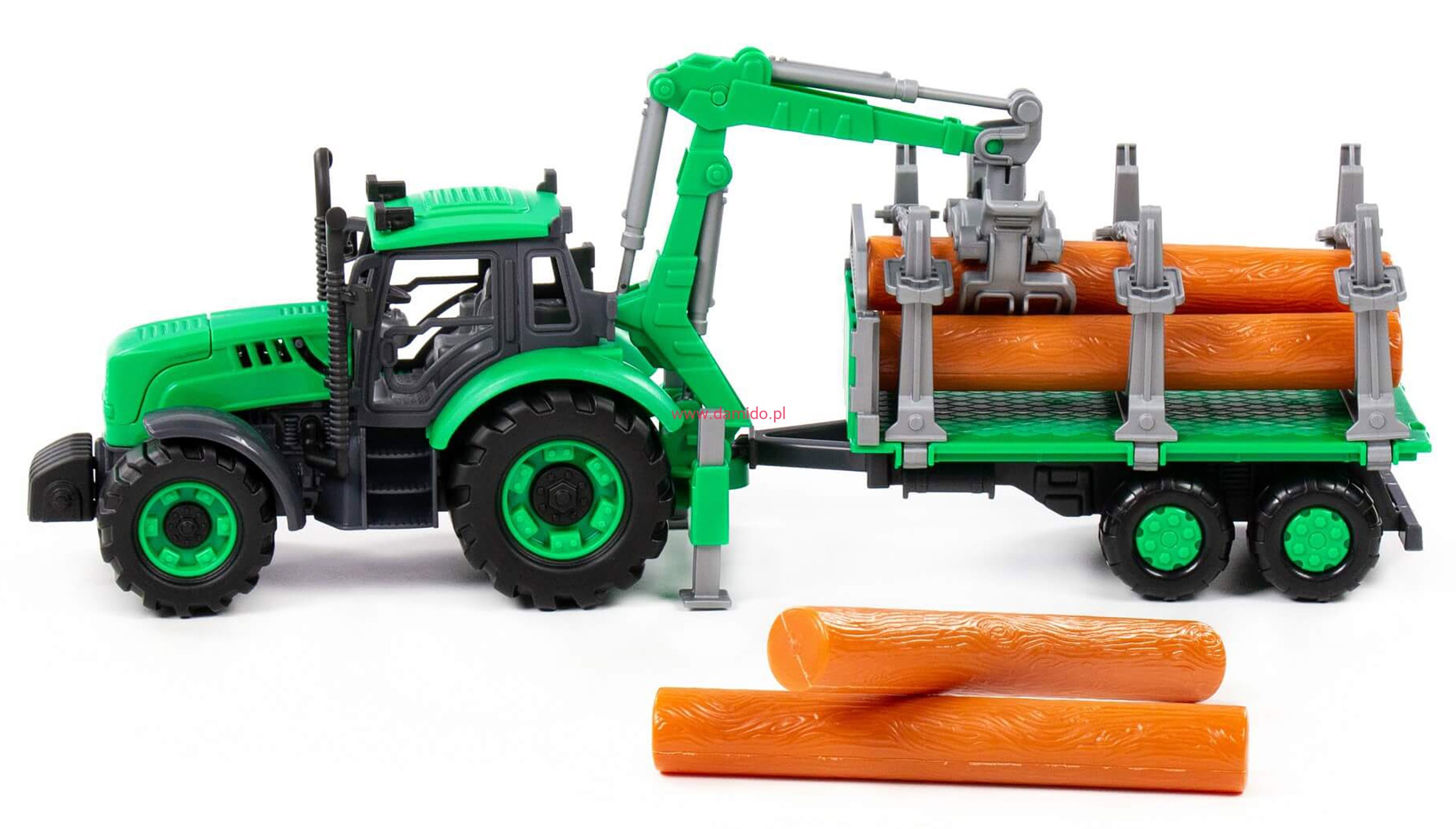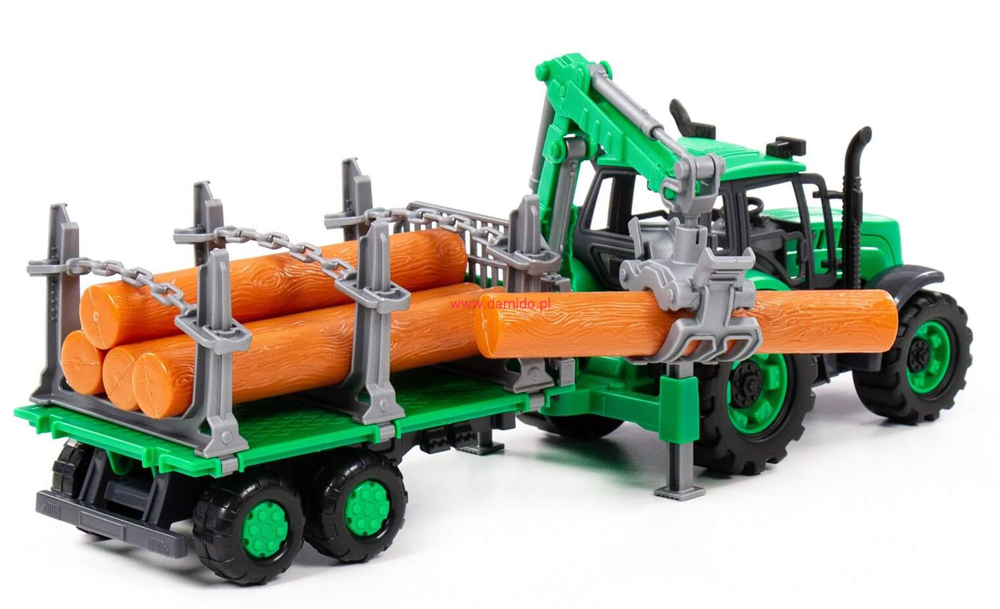 Traktor z przyczepą ) to doskonała replika prawdziwego pojazdu, zaprojektowana z dbałością o każdy detal. Wyposażony został w napęd friction i w chwytak do drewna. Można nim łatwo manipulować dzięki ruchomemu ramieniu.