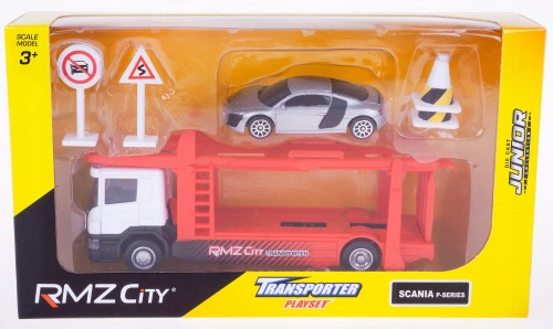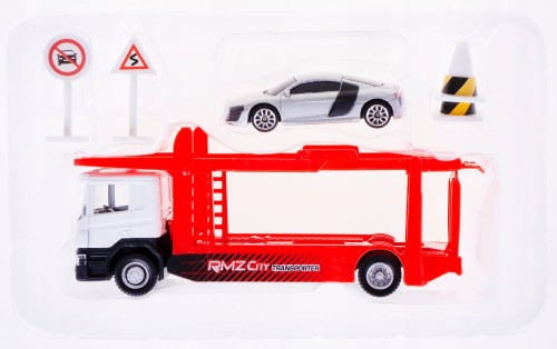 TRUCK SCANIA P-SERIES CIĘŻARÓWKA AUTO TRANSPORTER LAWETA + AUDI R8 + ZNAKI I PACHOŁKI MODEL 1:64 RMZ CITY CZERWONY K-356