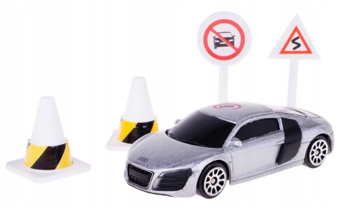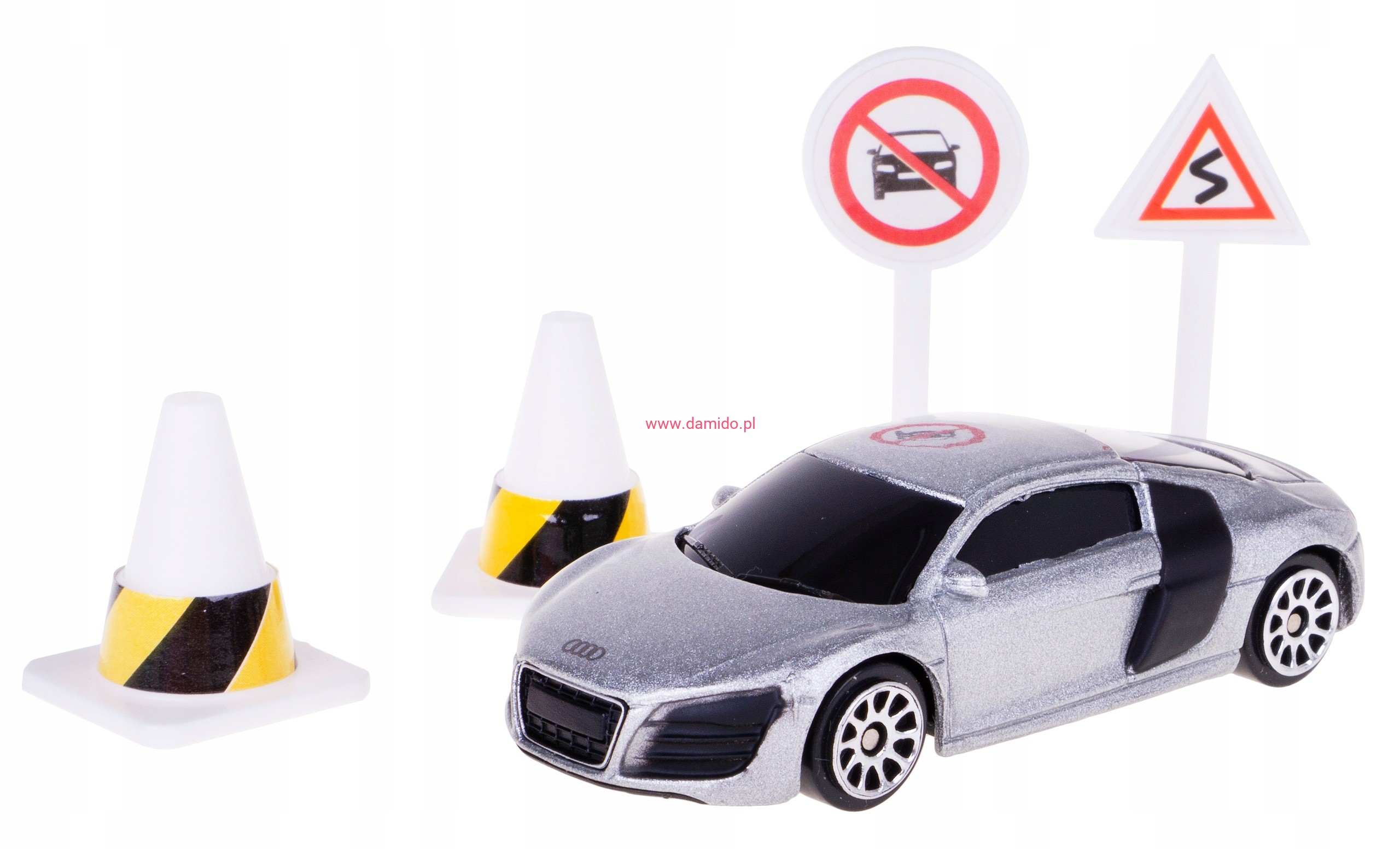 W zestawie znajdziemy również znaki i pachołki oraz resorak Audi R8 V10 w skali 1:64 wykonany z metalu (karoseria) i plastiku(podwozie).