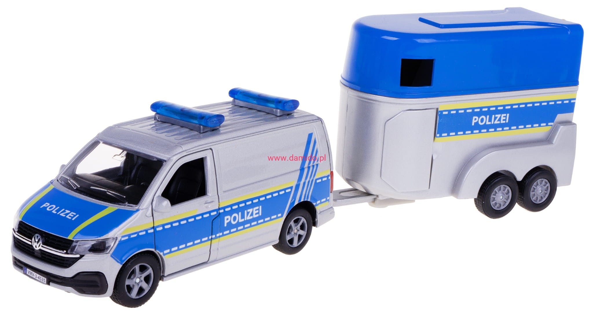 VOLKSWAGEN T6.1 2019 POLICJA Z PRZYCZEPĄ DLA KONI 26CM + 2 KONIE KIDS GLOBE