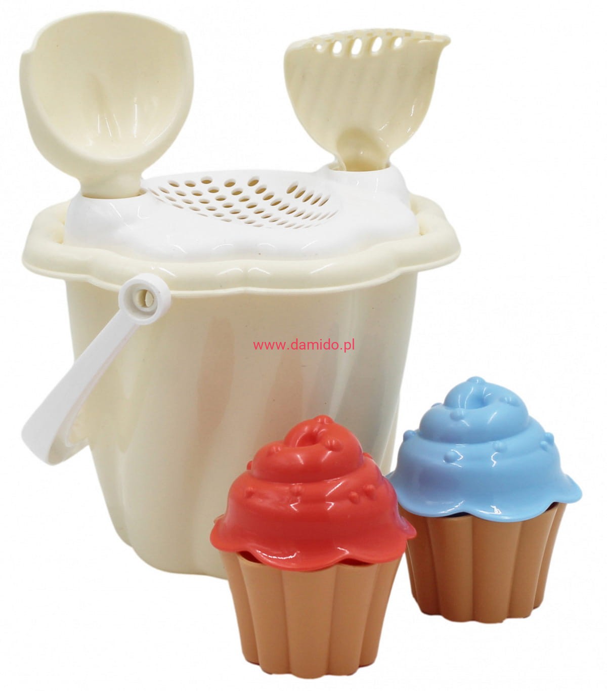 Niezastąpiony zestaw do zabawy w piasku, w ogrodzie na plaży lub placu zabaw, jak i w domu w połączeniu z piaskiem kinetycznym, składający się z 8 akcesoriów do piasku jak : wiaderko, wieko wiaderka sitko z otworami na umieszczenie foremek, łopatka, grabki, 2 foremki w kształcie babeczek i 2 foremki gałek.