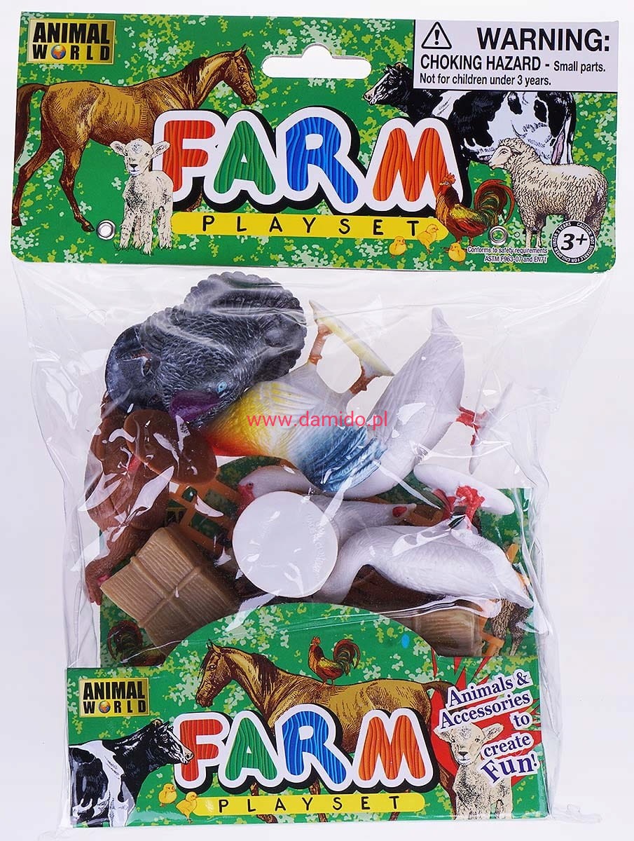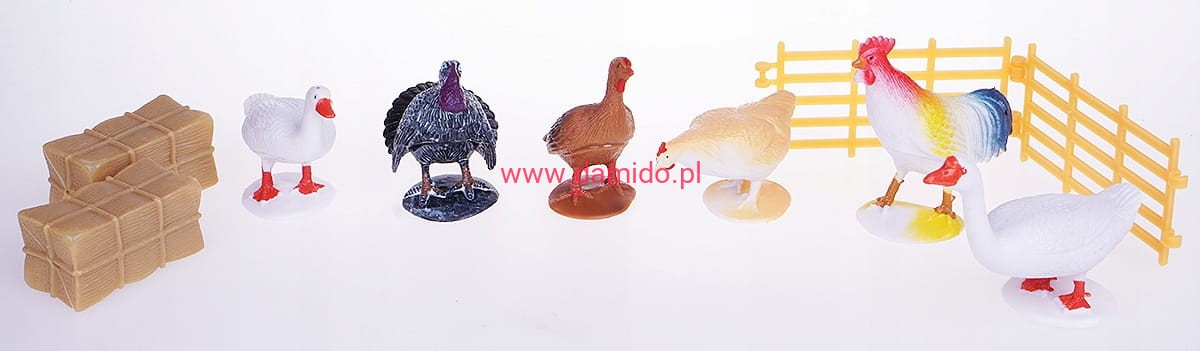 Zestaw składa się z 6 ptaków domowych wiejskicj : kogut, kura, indor, indyczki, kaczka i gęś oraz ogrodzenia (2 el.) i 2 snopków siana.