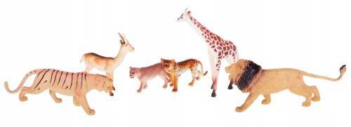 Zestaw składa się z 6 dużych zwierzątek dzikich jak : lew, tygrys, żyrafa, puma, gepard i gazela.