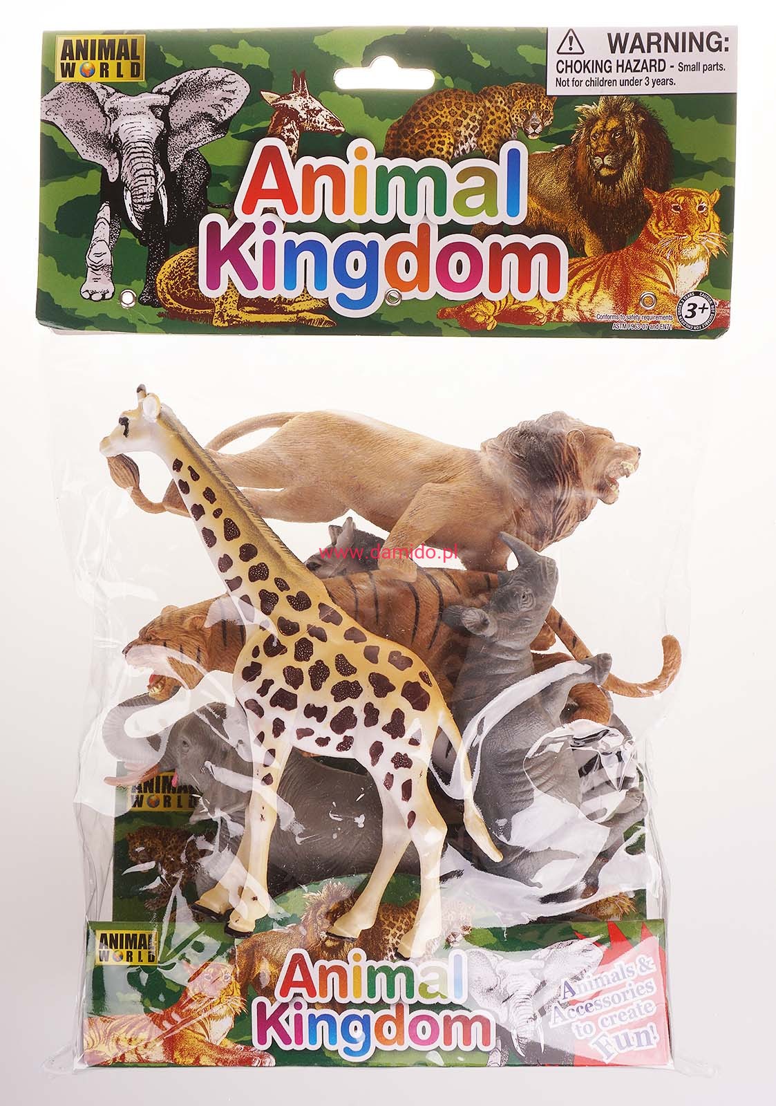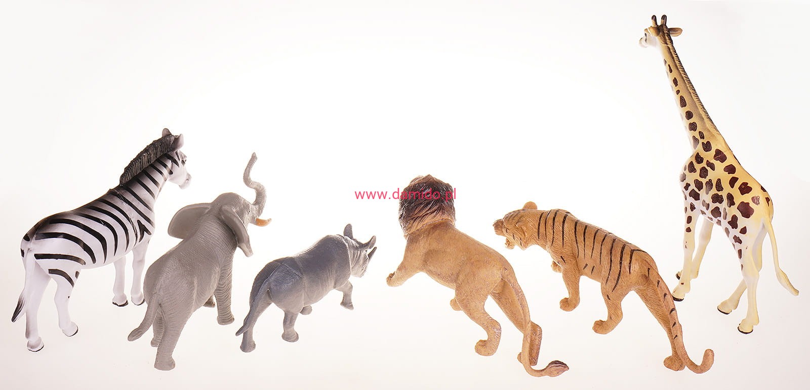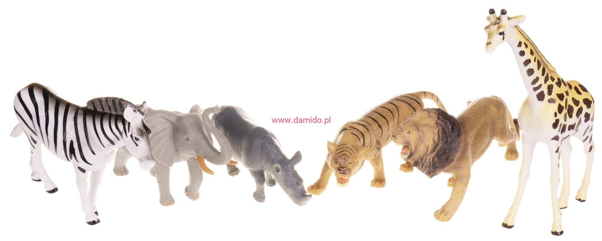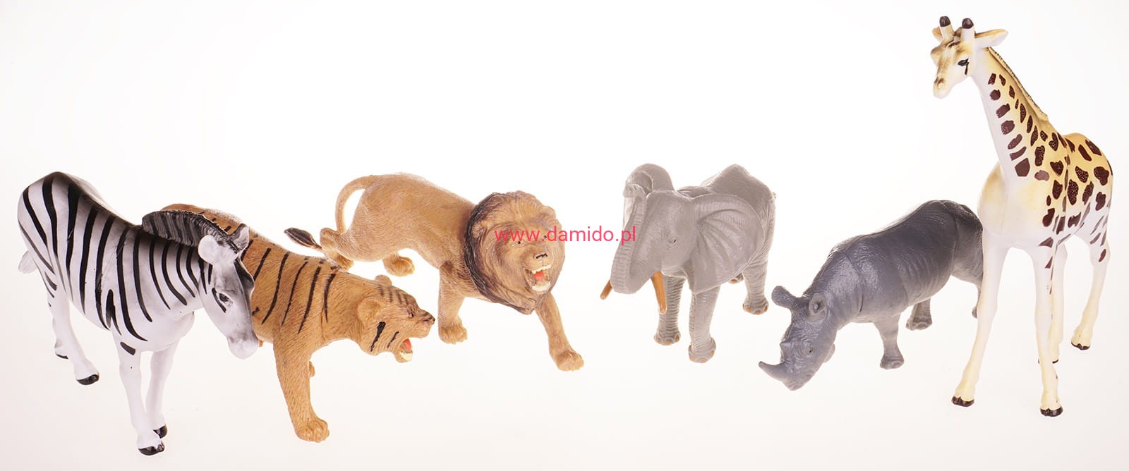 Zestaw składa się z 6 dużych zwierzątek dzikich jak : lew, tygrys, żyrafa, nosorożec, zebra i słoń.